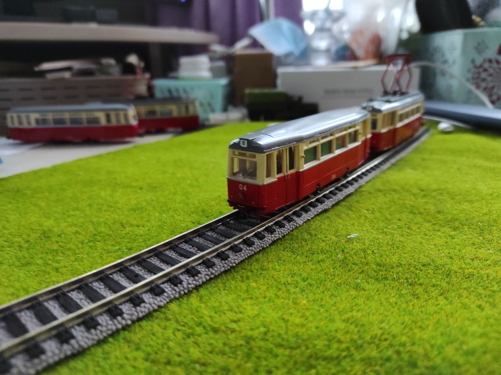 собрал пару трамваев на заказ,первый обычный вариант с голубой полосой,второй был расклеян и собран заново,в каждом вагоне кабина управления, полосу сделал серебристую-на подобии Евпаторийской готы с двумя кабинами в разных вагонах