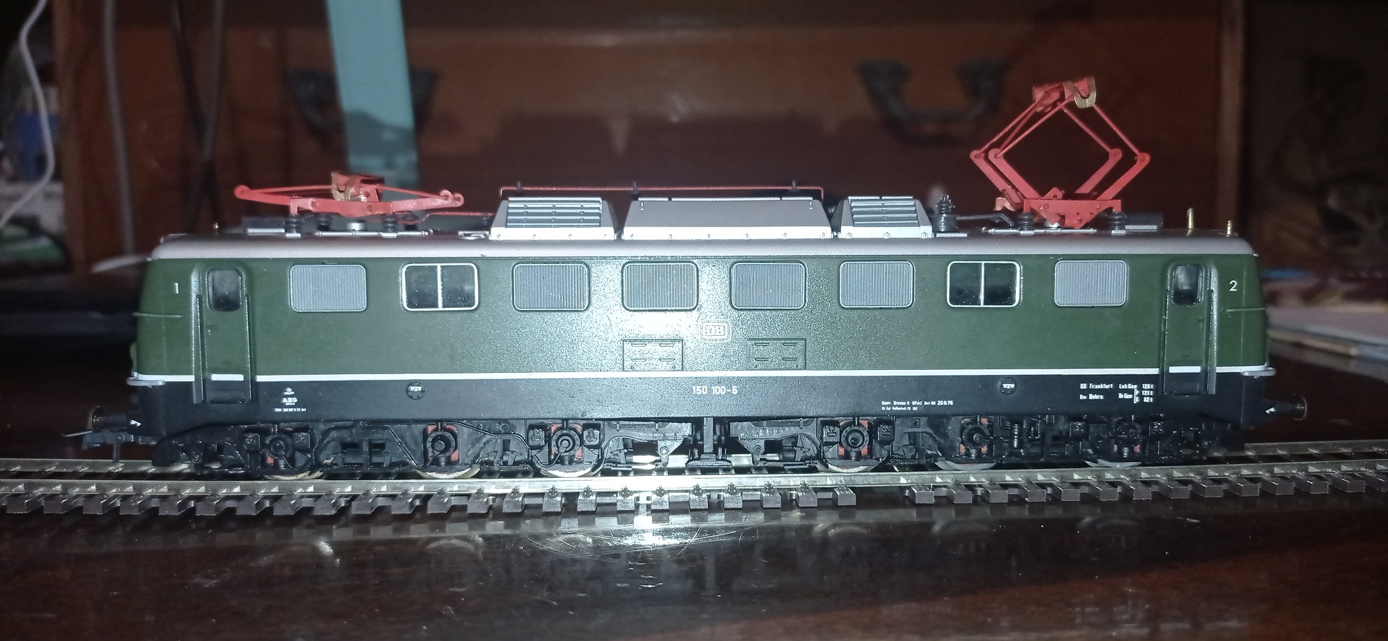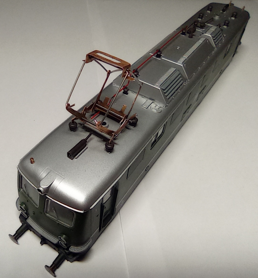Практически закончил работы по доведению того, что есть в наличии (кузов электровоза, боковины телег и колесные пары от резинохода), до состояния стендовой модели. Перекрасил пантографы, так как предыдущий красный был очень яркий. Остались мелочи - сделать подоконые поручни на обе кабины, имитацию электромагнитных тормозов между телегами и сделать одну утерянную площадку между фонарей со стороны одной из кабин, ну и покрасить то, из чего сделал сами телеги и раму. Пока не пригружал и свет не делал. Может, когда-нибудь и до этого руки дойдут. Главное, что электровоз стоит на ногах и может использоваться в сплотке с другим электровозом, как имитация двойной тяги или просто отдыхать на полке.