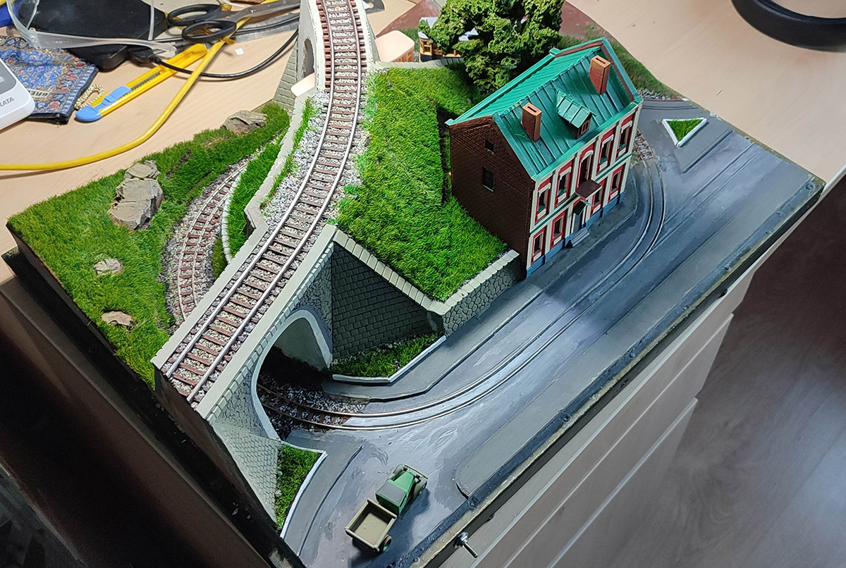 решил больше не тянуть и плотно начать делать микромакет на стол. Пока еще работы очень много, но в общих чертах вырисовывается. Для езды запланирован мой старий Х с прицепным вагоном или грузовой Х (у него ходовая пошустрее и намного менее шумная), в перспективе запланирован свет на макете и в грузовом трамвае. Трава сделана из китайского травяного коврика. Если выщипать клочки (я ножницами по металлу) и подкрасить в более реалистичный цвет из аерографа, то на удивление реалистичную высокую траву можно сделать