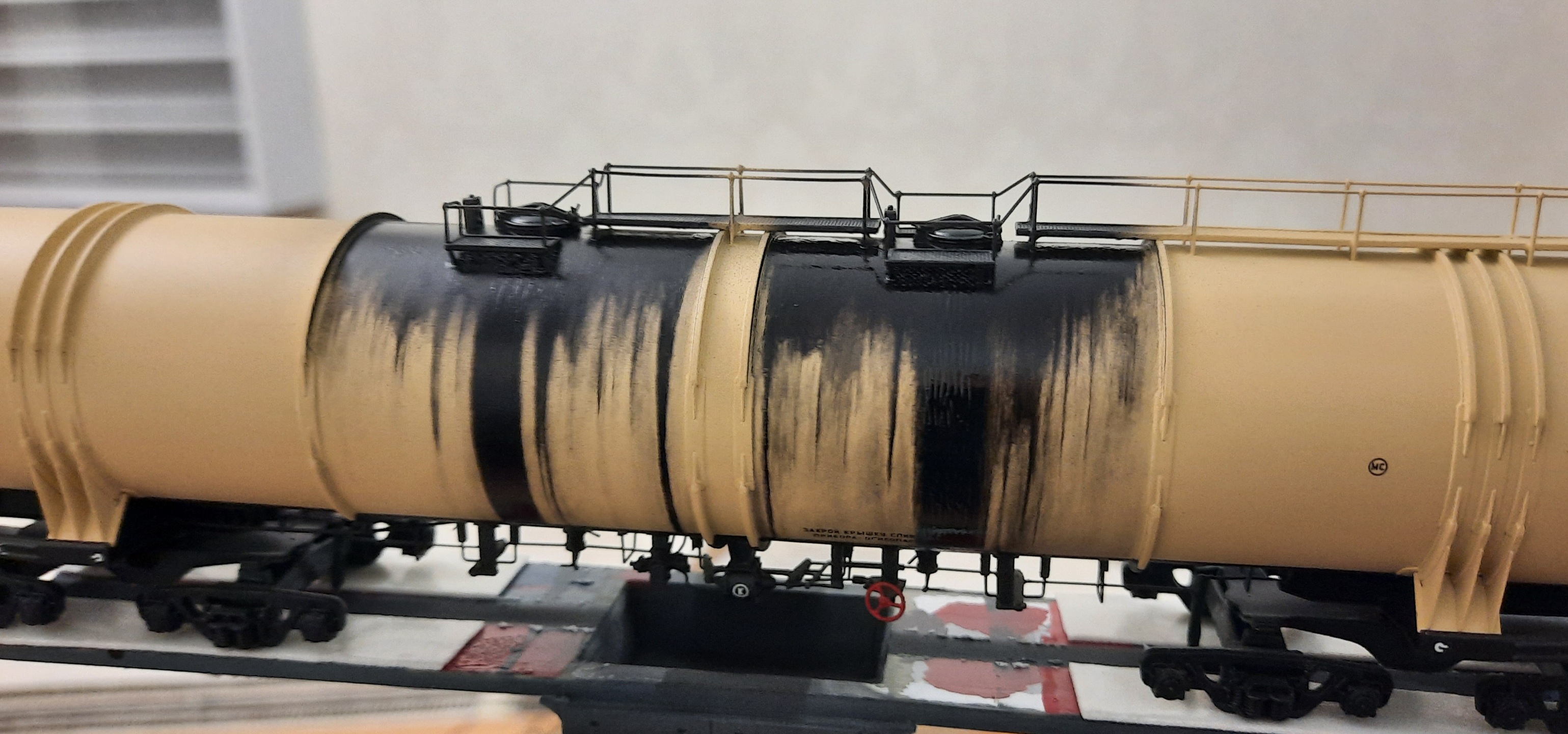 Совсем немного подкорректировал некоторые следы стекающей по котлу нефти, которые выглядели неестественно, и добавил бОльшее количество пятен и брызг. Дальше - матовый лак для фиксации масляных потёков, пигменты (эффекты припылённости). Финалом работ будут свежие блестящие потёки нефти поверх матовых старых. Сколов и ржавчины не будет: по моей версии цистерна неухоженная и немытая, но относительно недавно прошедшая ремонт.