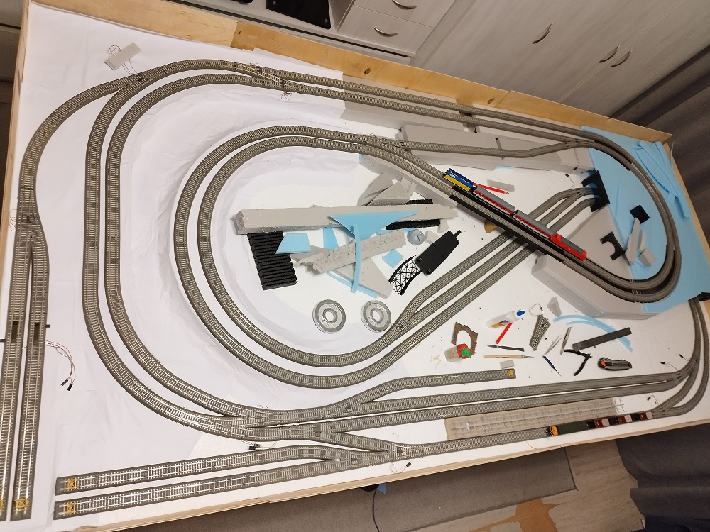 і я в невеликому ступорі бо зважаючи на те, що це не макет, а стіл, який повинен бути розібраний в будь-який момент, то у мене проблема з варіантами оформлення. стандартний підхід з монументальними горами і т.і. з гіпсу, а також посипки, баласт і інше - не підходять.