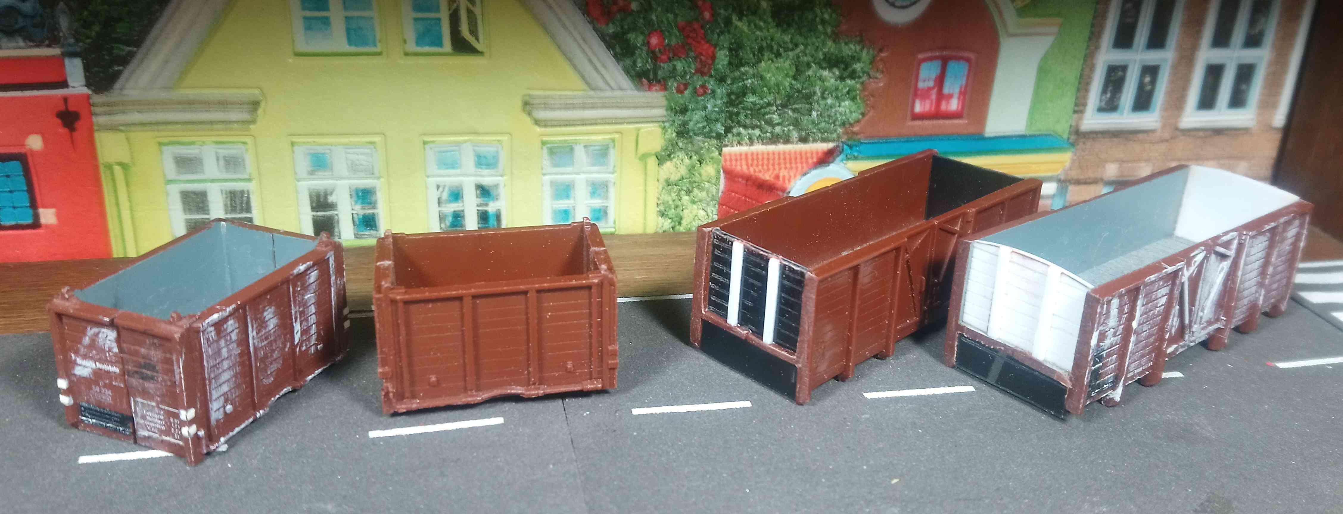 Тому одразу зарізав два жмура від Ріко. Тобто з двох кузовів напіввагонів вийшло чотири вагони Н0е. Два напіввагона, та два фельдбани для торфу. Наразі вони в процесі, та виглядають так. Також зробив ще вагінєтку для фельдбану з залишків Роко. Однак одного донора не зміг зарізати, бо чогось стало жалісно. Цілий же. Но то таке, минецця