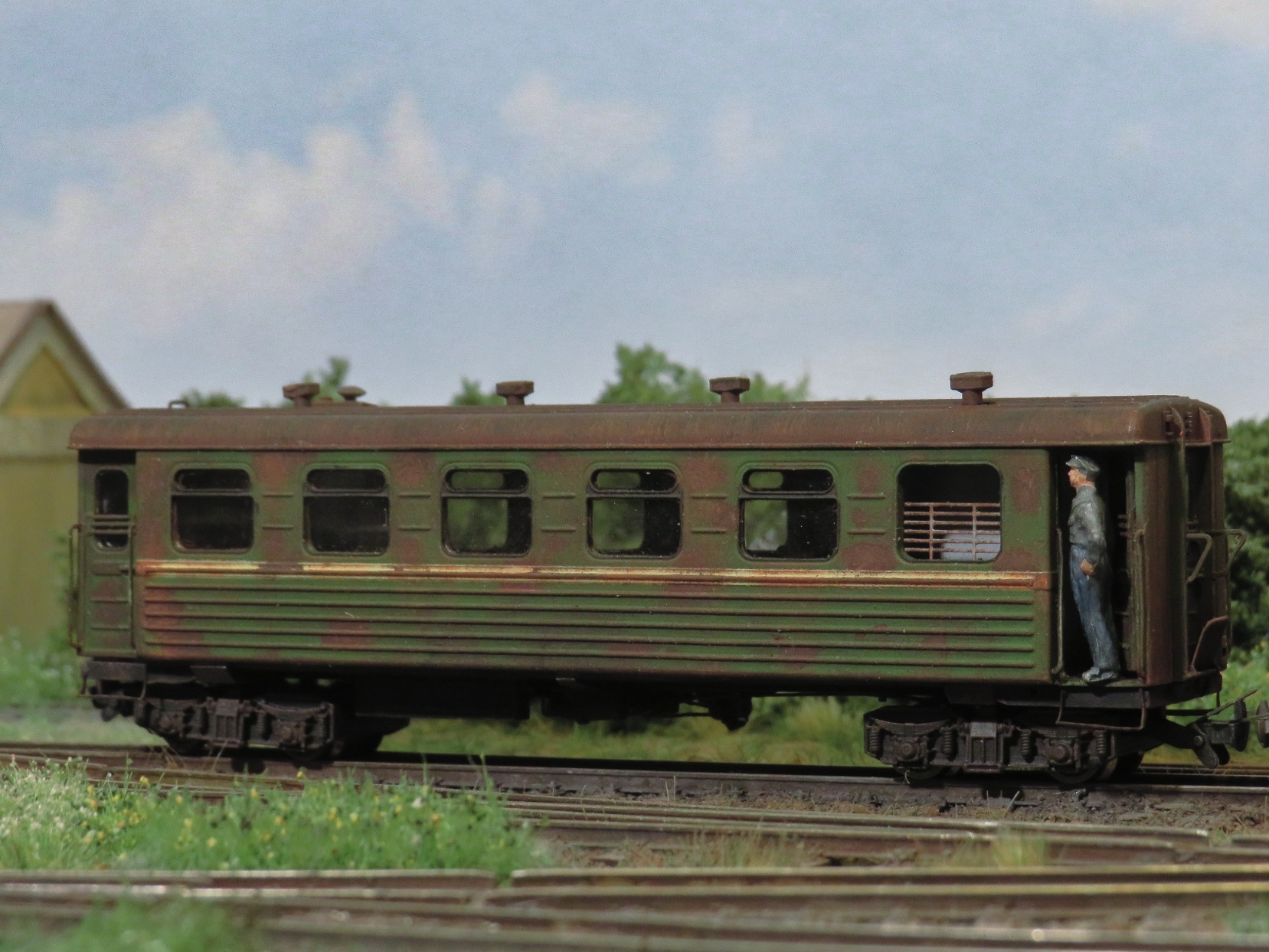 Этот вагон - часть "рабочего поезда", состоящего ещё из крытого вагона-склада (собран из кита RTM) и бригадного вагона ПВ40. Бригадник ничем особенным не выделяется - обычный ПВ40 с ликвидированными туалетом и котловым отделением.