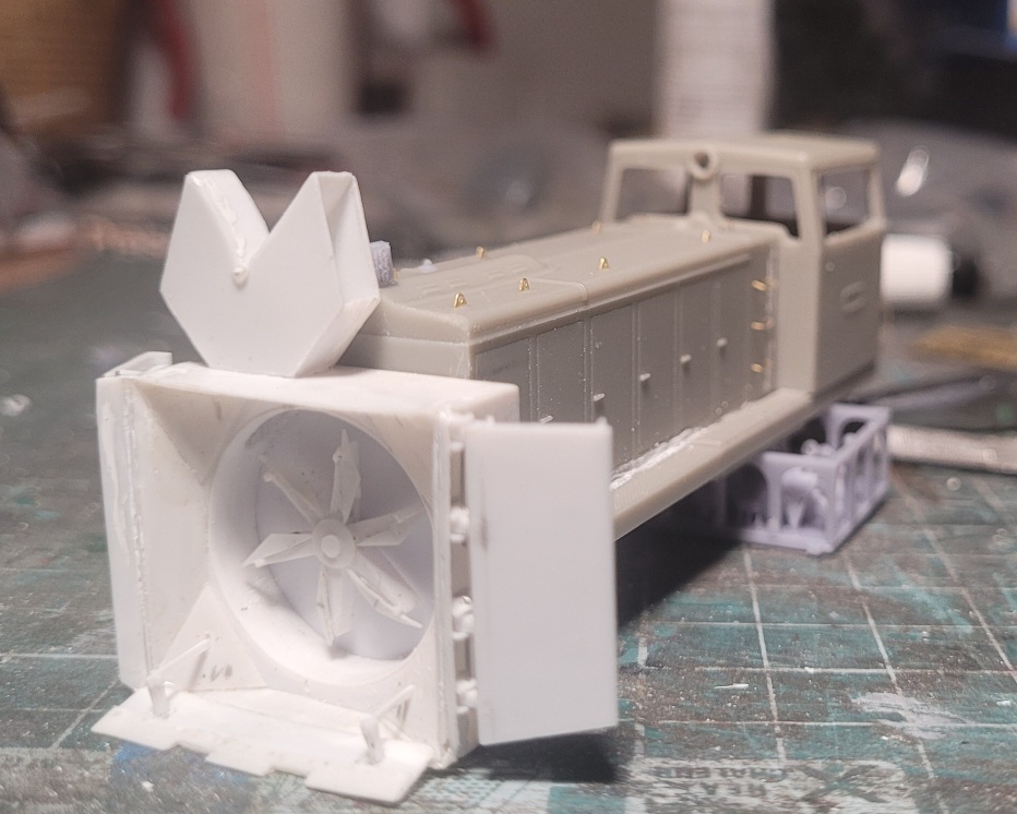 Чтобы не просвечивали кузов в местах установки прожекторов и буферные с обратной стороны, перед окончательной окраской я задул соответствующие места серебрянкой (Tamiya). Серебрянка в плане "светоизоляции", по моему опыту, показывает себя лучше чёрной краски. Tamiya-вская при этом обладает достаточно мелкой зернистостью.