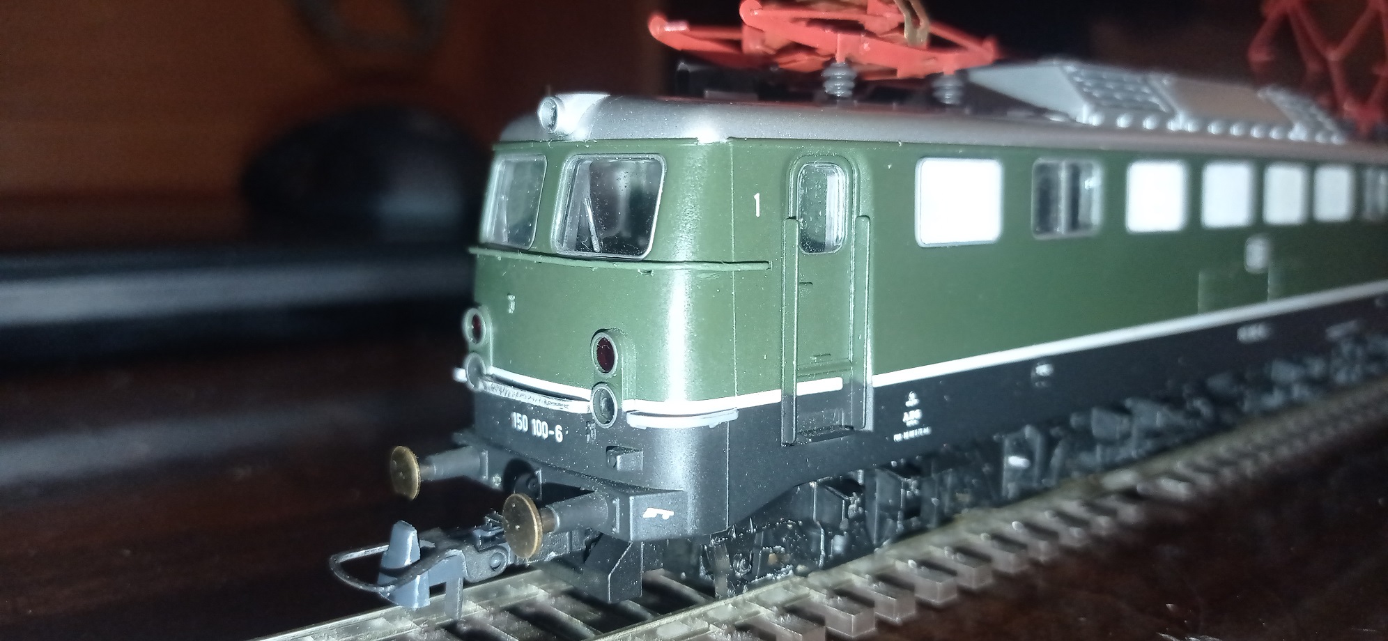 Практически закончил работы по доведению того, что есть в наличии (кузов электровоза, боковины телег и колесные пары от резинохода), до состояния стендовой модели. Перекрасил пантографы, так как предыдущий красный был очень яркий. Остались мелочи - сделать подоконые поручни на обе кабины, имитацию электромагнитных тормозов между телегами и сделать одну утерянную площадку между фонарей со стороны одной из кабин, ну и покрасить то, из чего сделал сами телеги и раму. Пока не пригружал и свет не делал. Может, когда-нибудь и до этого руки дойдут. Главное, что электровоз стоит на ногах и может использоваться в сплотке с другим электровозом, как имитация двойной тяги или просто отдыхать на полке.