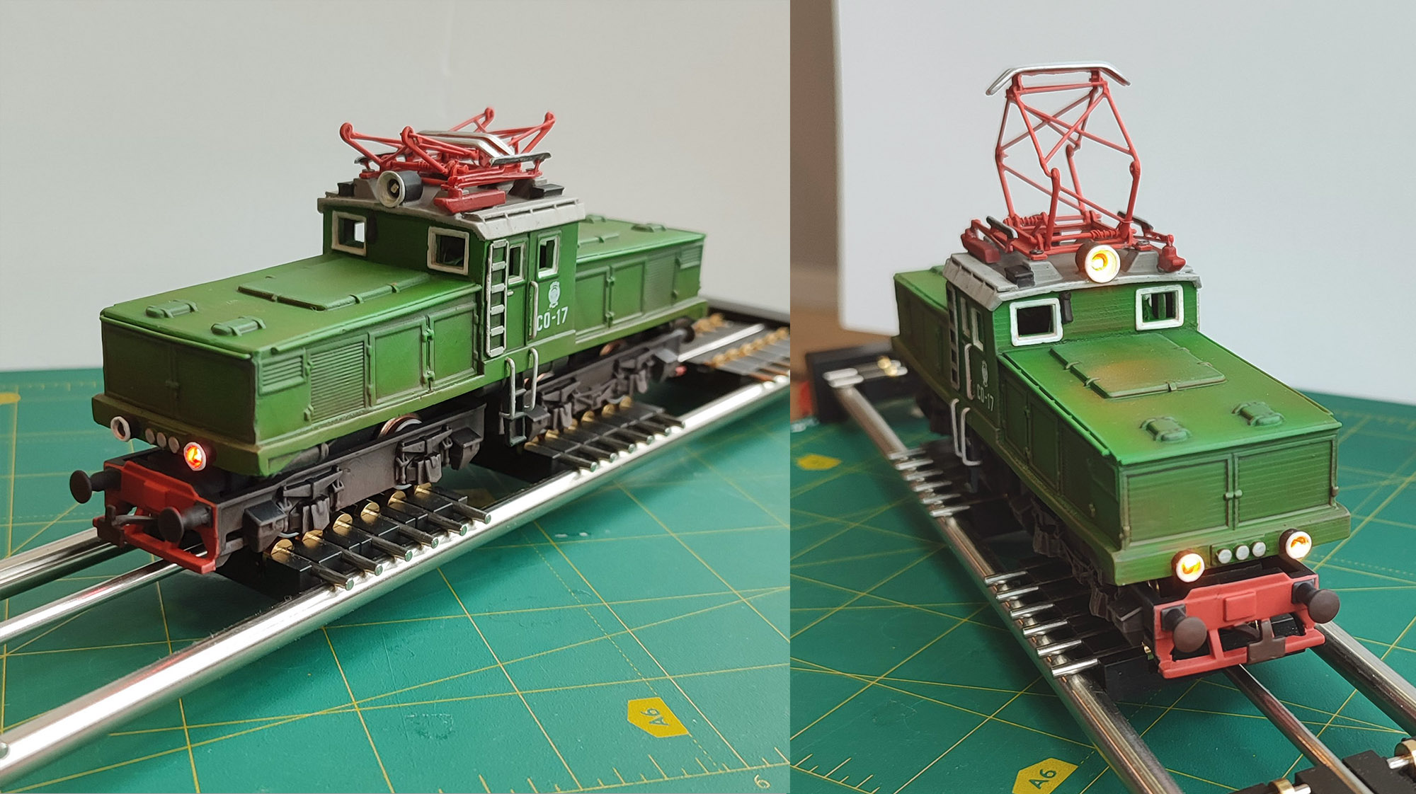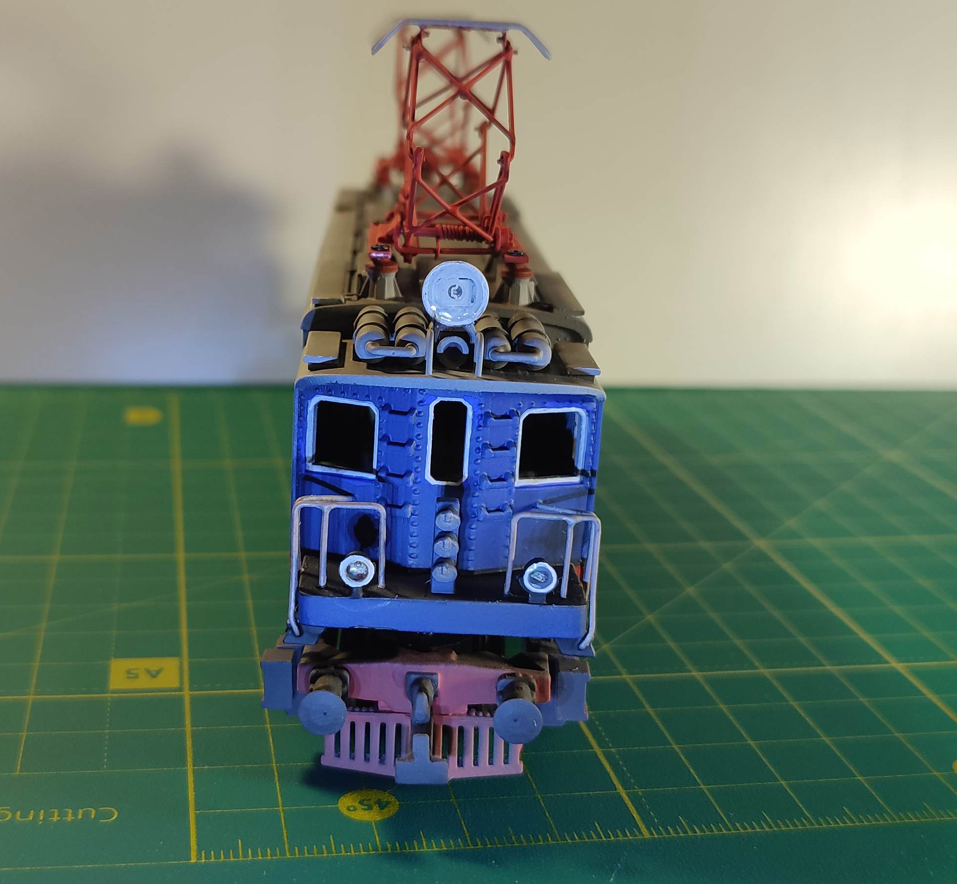 практически окончил ВЛ-19. Стекла позднее напечатаю и вставлю, когда прозрачную смолу куплю. Свет по ходу движения, заднего красного нет. Фотографии прототипа нет, если не ошибаюсь 13й был в том же депо, что и евротрейновский 14й. С окраской кузова вышел небольшой брак, лак вступил похоже в реакцию с остатками моющего средства в акварели на смывке, потому немного белых точек и разводов присутствует на синем.