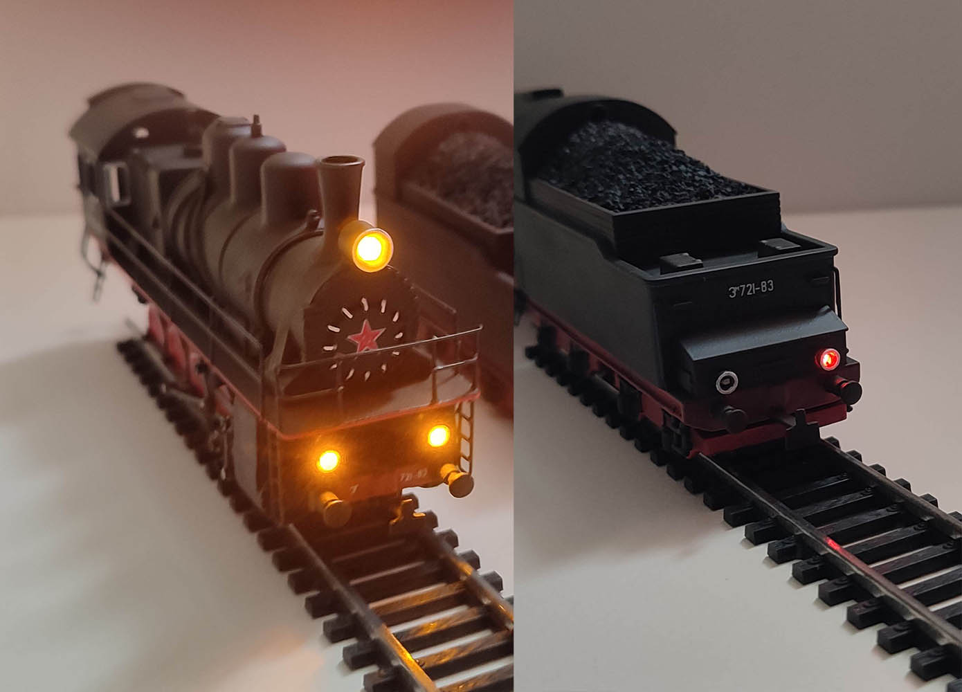 с времени последнего поста у Эм сделал ПРМ (зачернил жидкостью для холодного воронения), установил освещение и нижнюю крышку паровоза поменял на стеклотекстолитовую с усиками токосьема с двух коллпар. С 4 коллпар контакты из 0.2 мм стальной проволоки явно слишком сильное сопротивление создавали. Сцепка паровоза с тендером разьемная, подпружиненная. Штекер также просто вставлен в розетку в стенке тендера. По отдельности части довольно тяжелые, не хотелось делать фиксированную сцепку во избежание поломки посадочних мест. При движении вперед горит задний красный фонарь, ну и передний и задний свет на месте. Спереди красный фонарь не стал ставить, так как провода все таки видно.