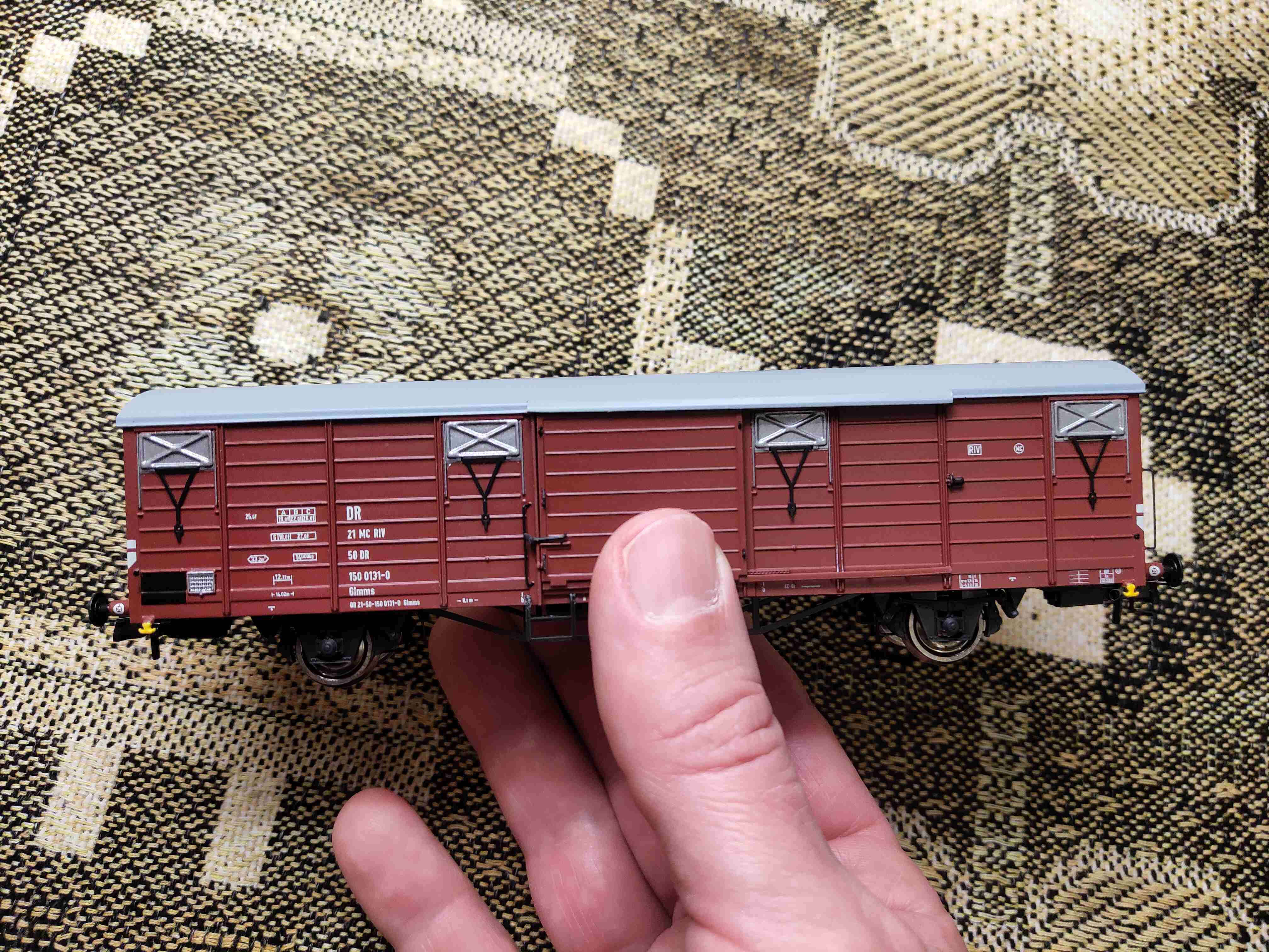 Как вам пёстрые узоры на моей скатёрке? Не перебор? К слову, рама вагона из металла, что, как заявлено, очень положительно влияет на характеристики поката. Забегая вперёд, могу отметить, что движение по рельсам у вагонов образцовое