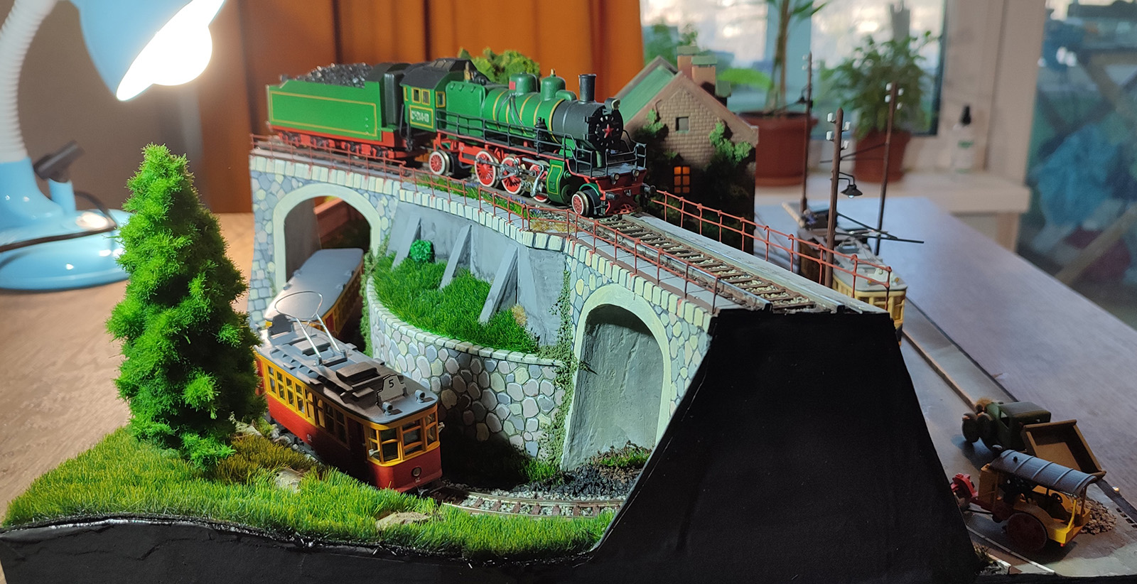 В общем доделал микромакет (надо будет человечков подобавлять и может в перспективе на рельсы ток подвести, что б свет в локомотиве был), выложу как есть. Размер 48х37 см. По ссылке видео на гугл диске