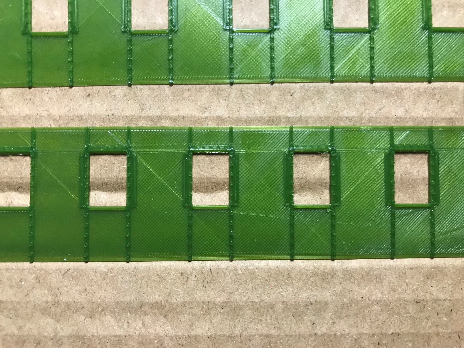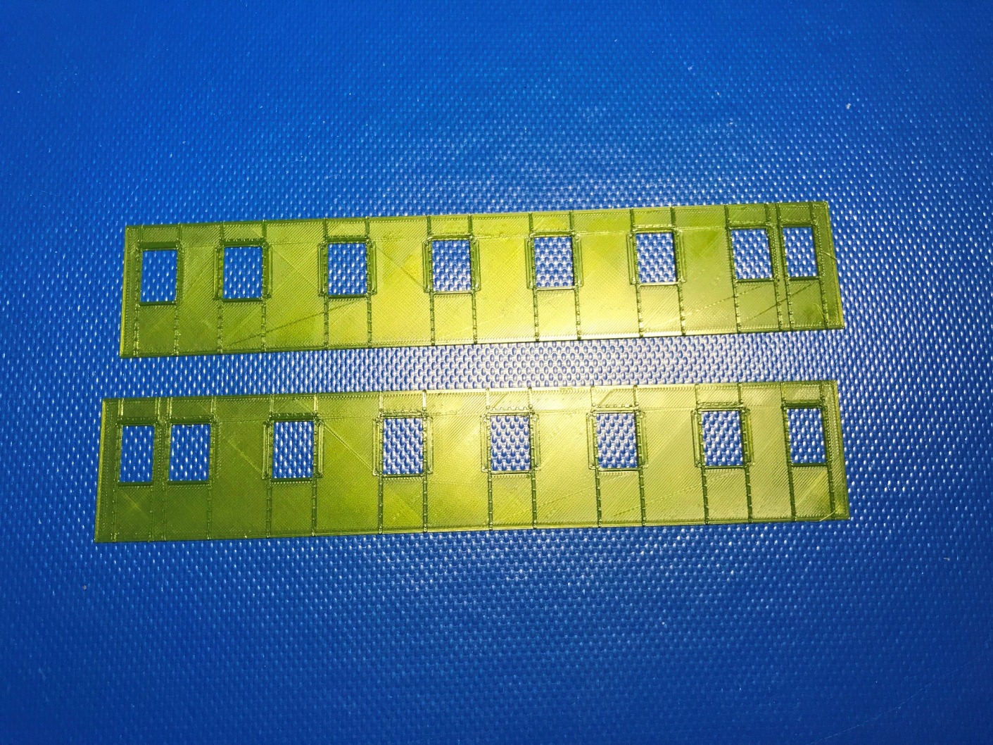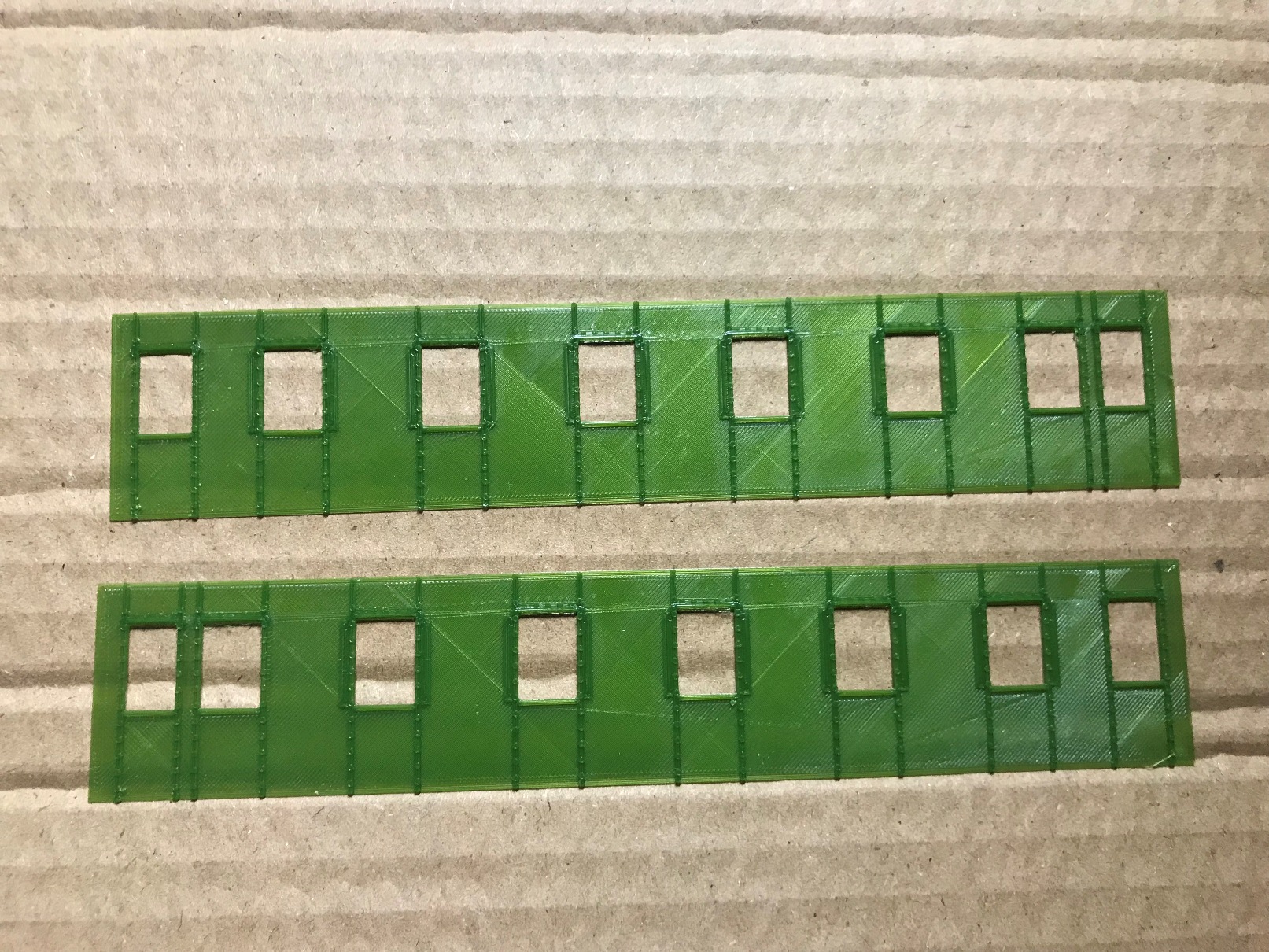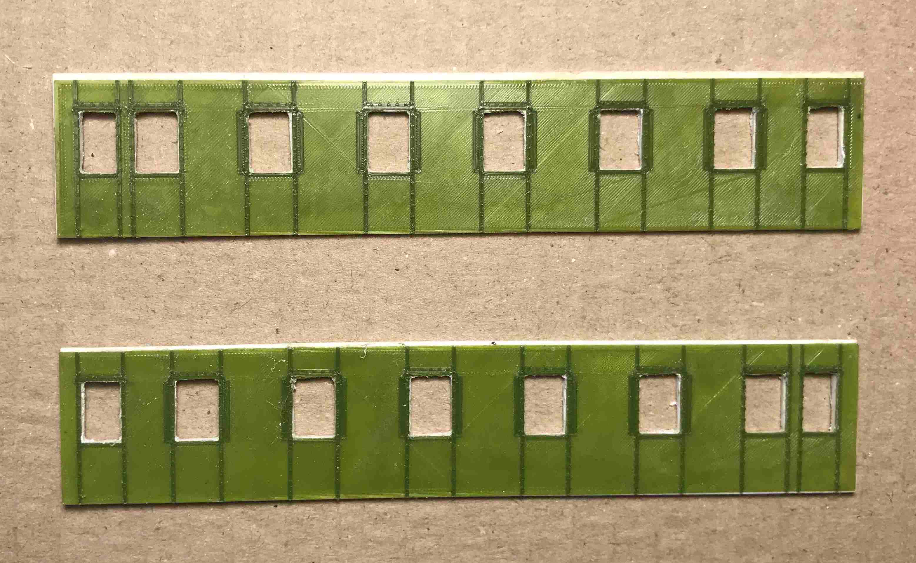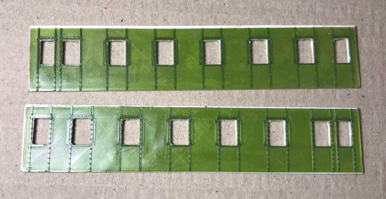 Бокові стінки двовісного вагона дальнього сполучення на базі "Єгоровца". Ідея в тому, щоб переробити приміский "егоровець" на такий. Знимаемо все зайве з боковин, трохи зсовуєм вікна, наклеюємо ці деталі поверх боковин. Іх товщина 0,3 мм. І отримуєм гарний результат. ;)