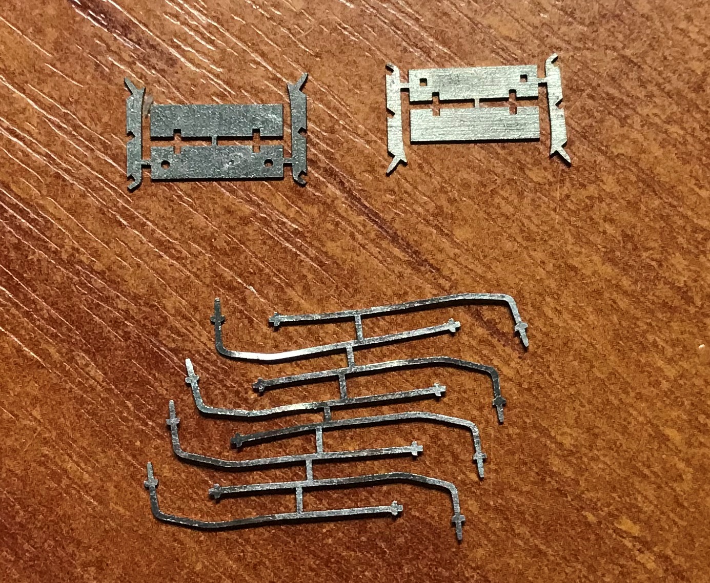 Отримав нову партію деталей лазерного різання. І старе – поручні котла та підніжки для паровоза ОВ, поручні тепловоза ЧМЕ-3 від Модіміо, зчіпки для старого Піко, у тому числі й для Бр-130. Нові розробки - деталі поручнів для вантажних вагонів з гальмівною будкою від Піко (на другому фото, досить часто вони на моделях відламані), перехідні майданчики та сходинки з поручнями для вагонів - "єгорівців".