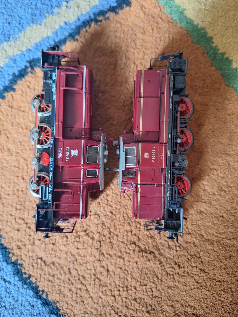 Доброго вечора, панове. Маю v60 від Roco, дуже побитий, але сучасна модель, з маховиком, NEM шахти, динамічні зчіпки. Привід на одну колпару з бандажами. З мінусів - жахливий стан поручнів та підніжок. Замовляти запчастини не вмію і не планую, а вони ніби з капрону і клей їх не бере.
