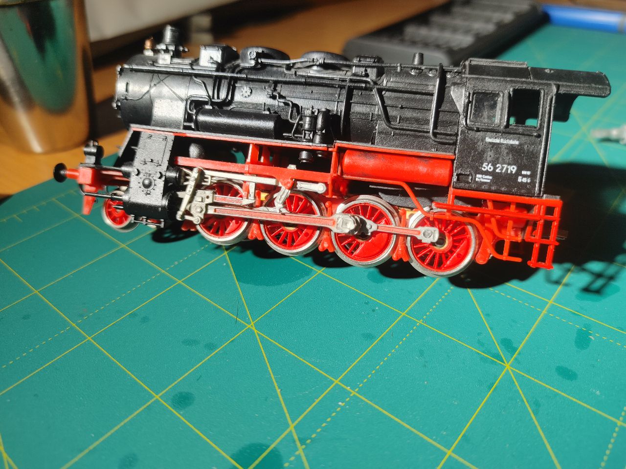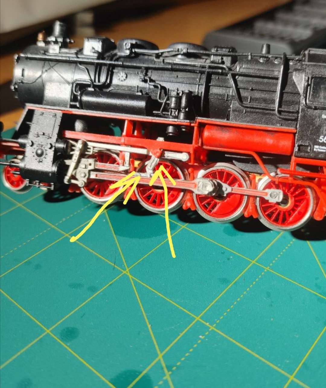 Также возможно выпирающие штифты на колесах что фиксируют сцепные дышла,цепляют дышло что идёт на цилиндры.