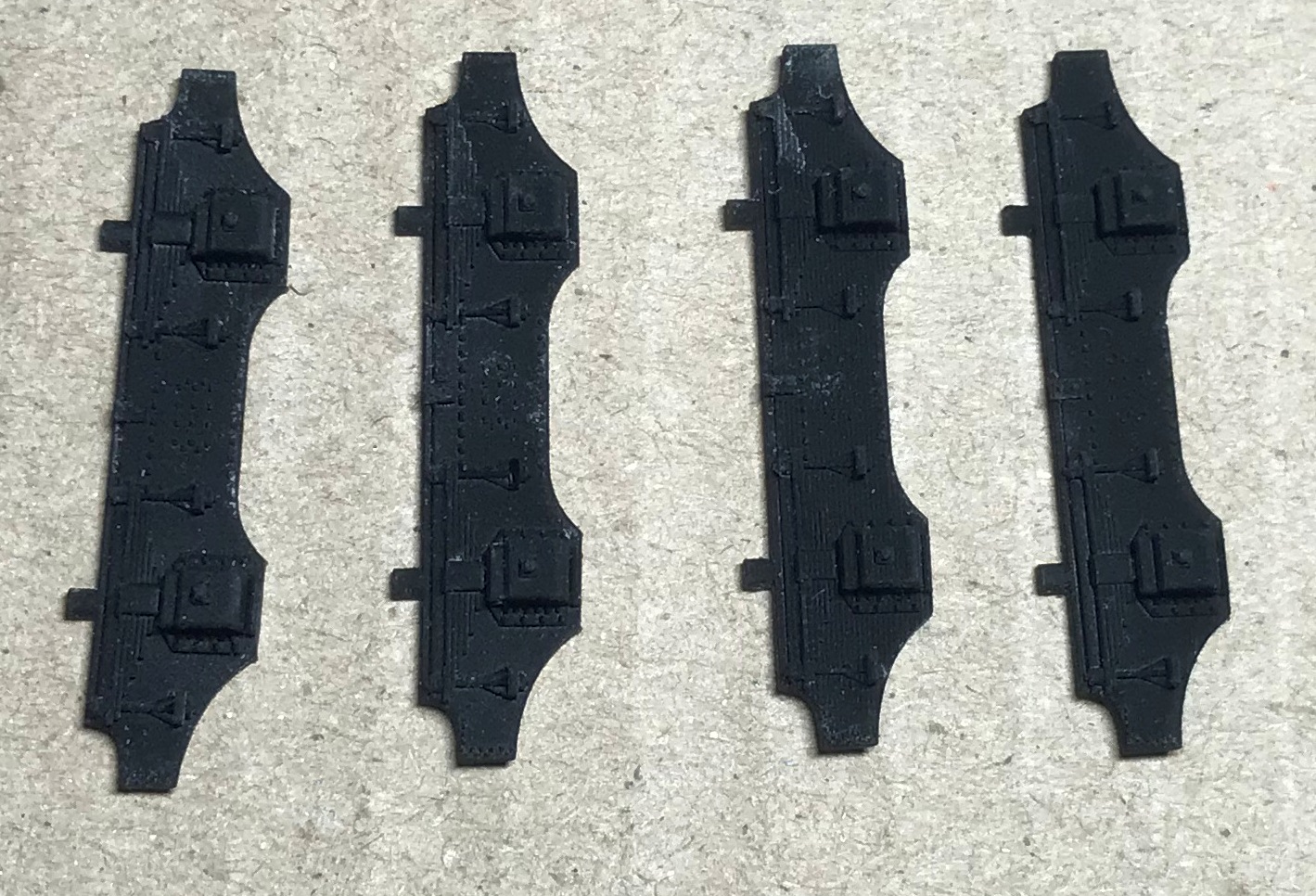 Боковини візочків 4-осного тендера до паровоза ОВ. Візочки вагонів типу "Даймонд". Зроблені з регулюємою довжиною зчепки, по потребі. Дахи до тепловозів BR-110 (V-100) старого PIKO. Ще дефлектори Чеснокова діаметром 320мм для вагонів і зчепки для заміни гачка Флешман на петлю Пико двох видів. Зчепки покажу згодом, як встановлю петлі.