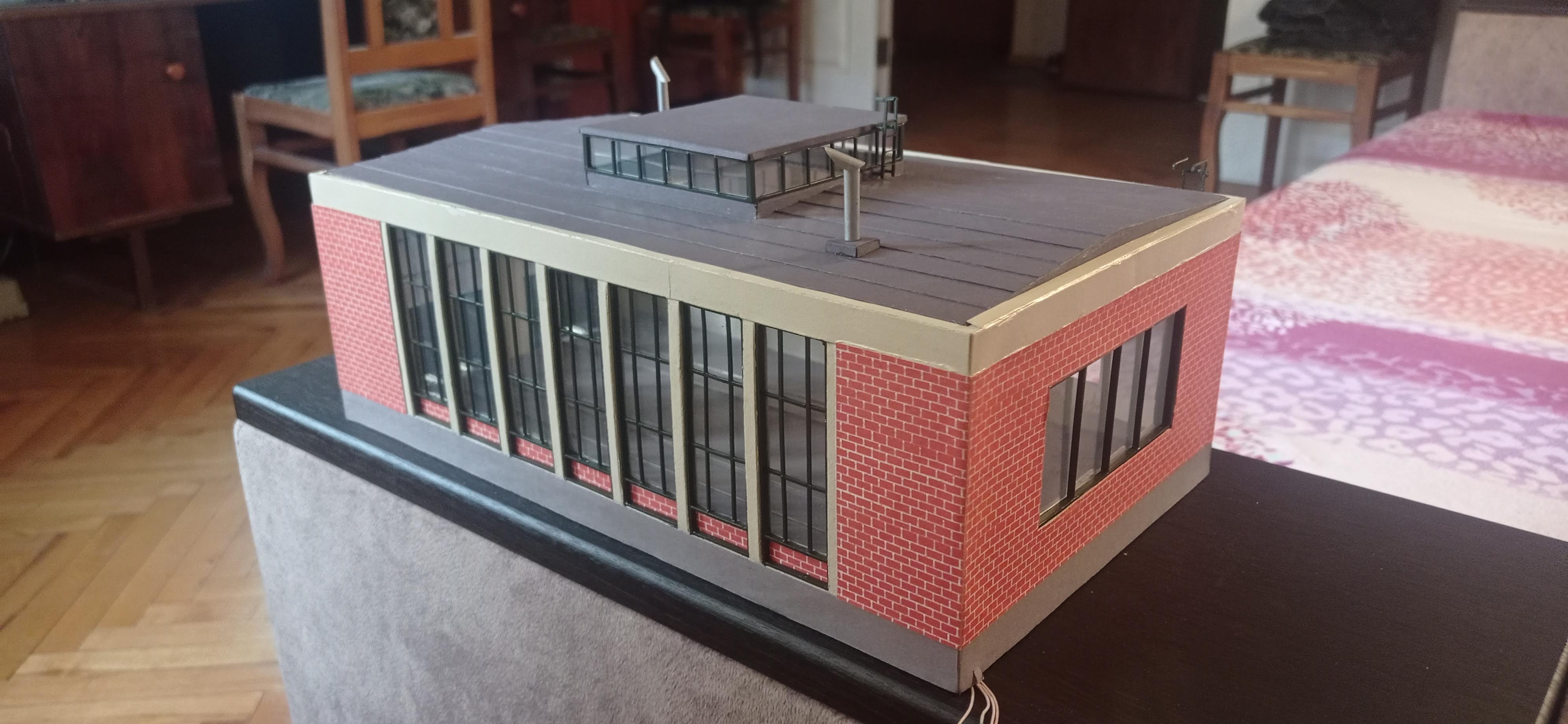 Спочатку на дах наносив колір, схожий на іржу. Після висихання фарби наносив лак для волосся в декілька шарів і поки лак не висох, насипав солі. Дав просохнути і після цього задув фарбою з балона. Після висихання зняв крихти солі. Потім можна було вже бруднити далі. Підпори для вагона з паличок для кави. Зробив скління. Зашив крайні вікна з обох сторін дошками. Вікно санвузла зашив металевим листом. Далі буде.