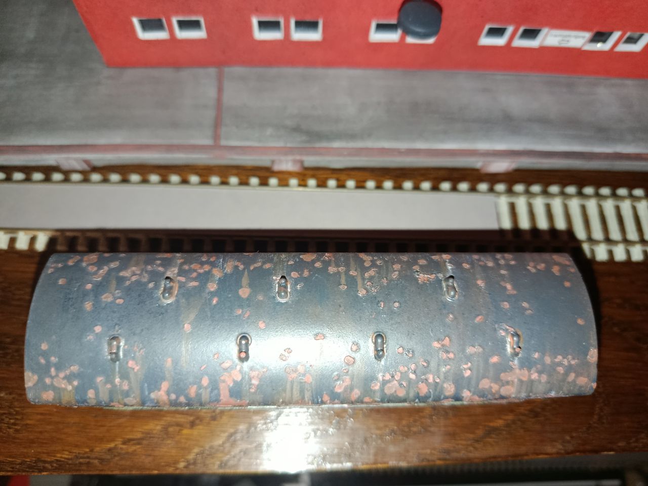 Спочатку на дах наносив колір, схожий на іржу. Після висихання фарби наносив лак для волосся в декілька шарів і поки лак не висох, насипав солі. Дав просохнути і після цього задув фарбою з балона.