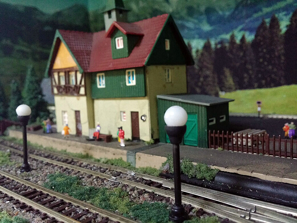 по задумке там будет перрон, но у меня его пока не получилось сделать красиво - была 1 попытка, пластик полетел в мусорку, мне не понравилось. просто междупутье слишком маленькое и нада делать узкий перрон, а он смотрится коряво, поэтому пока хожу думаю шо делать! А на перроне присобачить еще фонарей не проблема, токо их тогда будет слишком много!