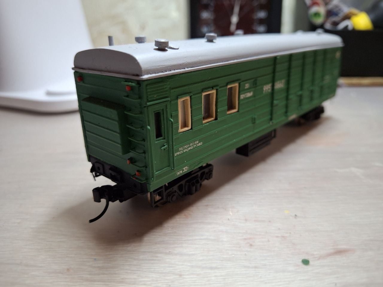 Нещодавно моя колекція поповнилася ось таким цікавим спец.вагоном.Робота В.Орешко(якщо не помиляюсь).Модель зацікавила своєю багатофункціональністю,його використовували як:багажний,поштовий,хліборозвозочний і пізніше бригадний або вагон супроводження.Для мого відновлювального составу він ідеально підійшов і буде їздити разом з жд краном.