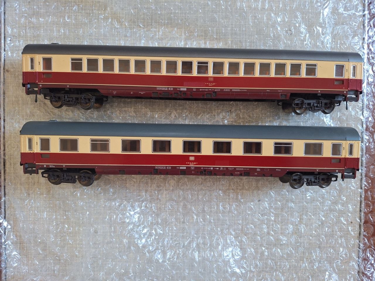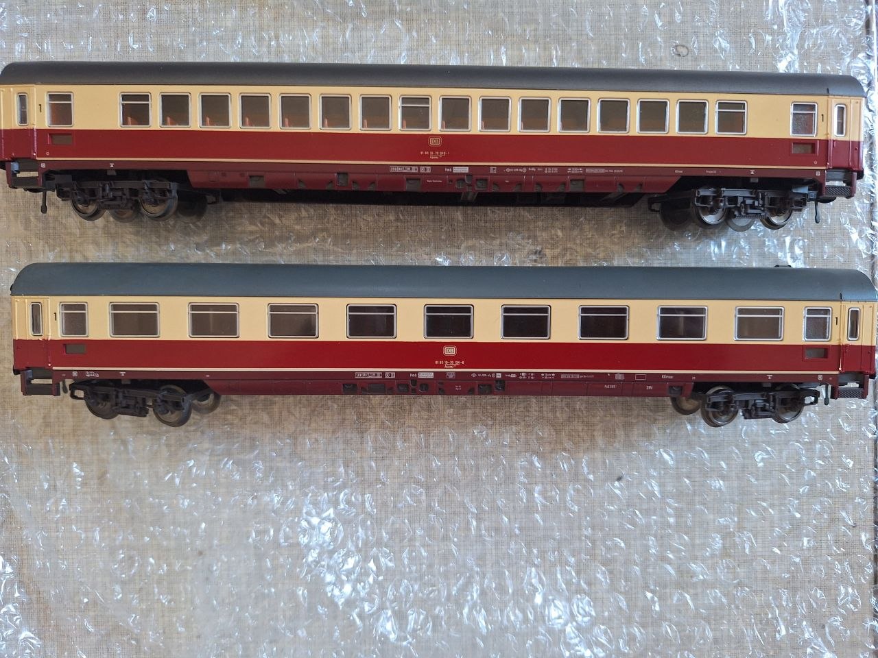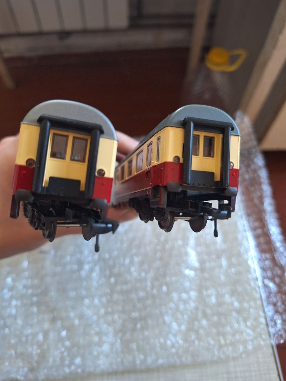 Продам 2 вагони фляйшман TEE. Ці яскраво-червоні і бежевий жовтіший, собі залишив темно-бордові і бежевий біліший і чорні днища. Тож можете бачити темно-бордові днища від моїх вагонів. Також дах іншого відтінку. Струмоз'єму нема, але неважко зробити. Ціна 1100 за два вагони.