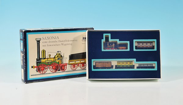 первоэпошный набор "Саксония".Лок с тендером(и весь поезд) толкал крытый вагон.