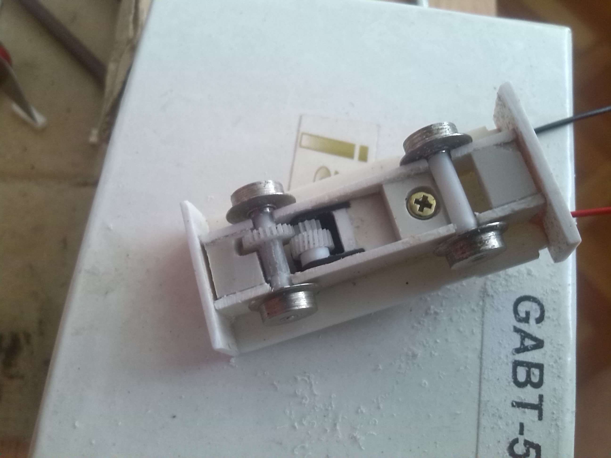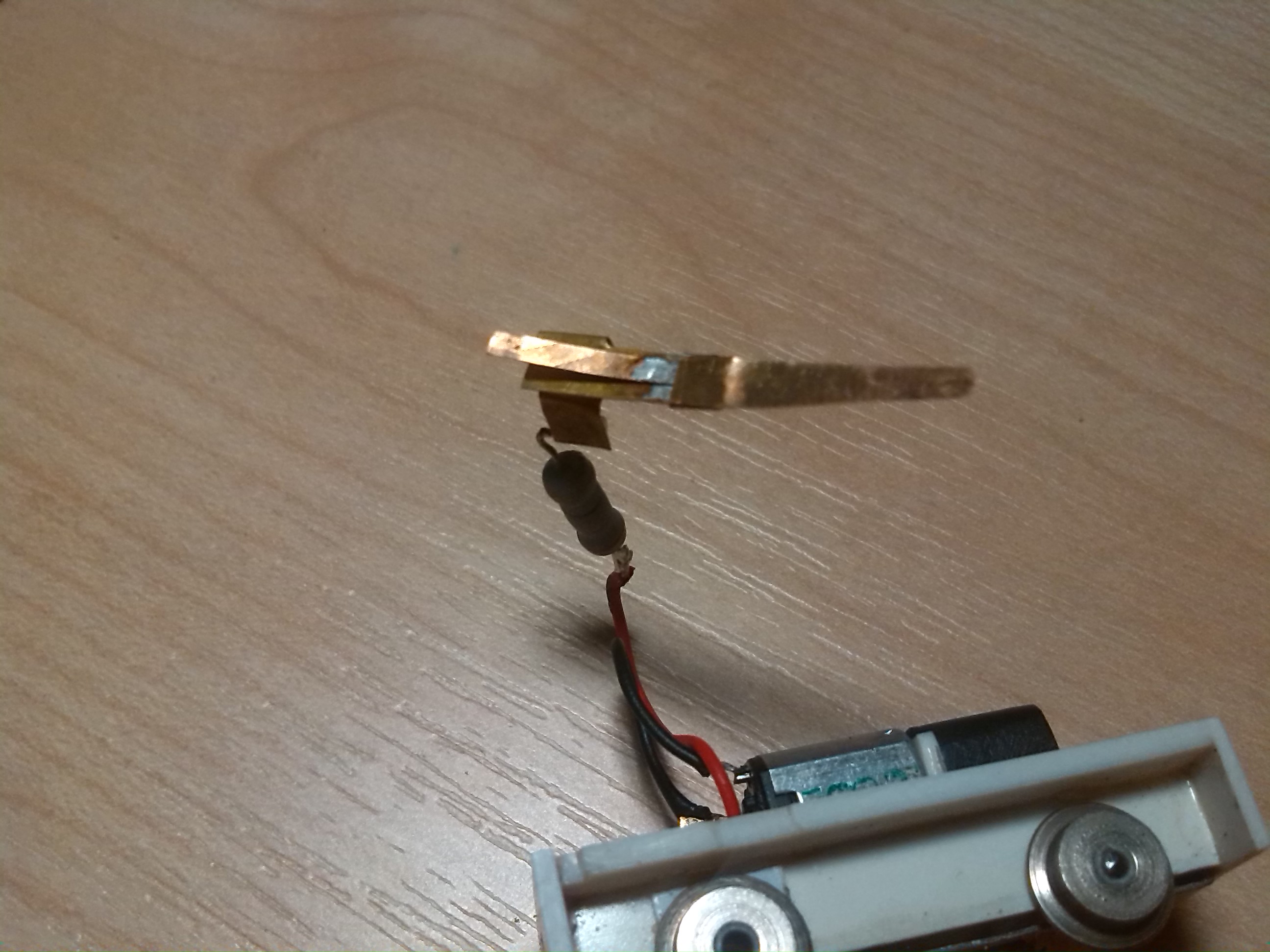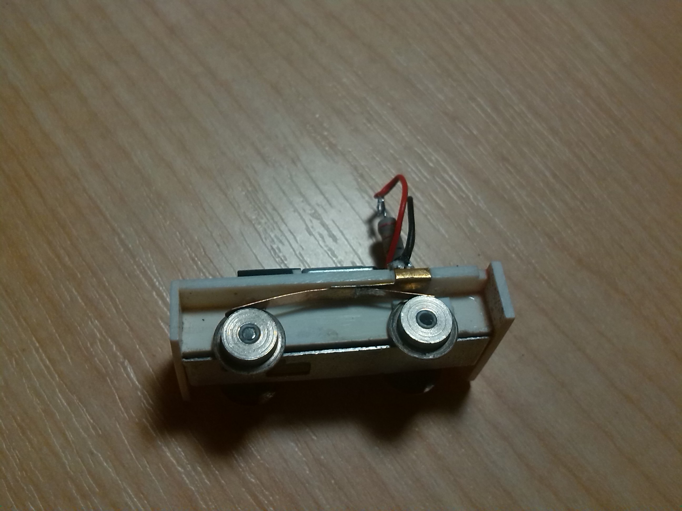 Stinky - Доброй Вам ночи. По проводам сам думал что нужно взять потоньше, но использовал что было под рукой. Красоту будем позже наводить - тут главное чтобы все работало. А по поводу контакта - тут нужно подумать. Можно припаять лепесток подлиньше на оба колеса и один край сделать потоньше, который будет опираться на ведомую пару. Надо попробовать. Спасибо за идею.