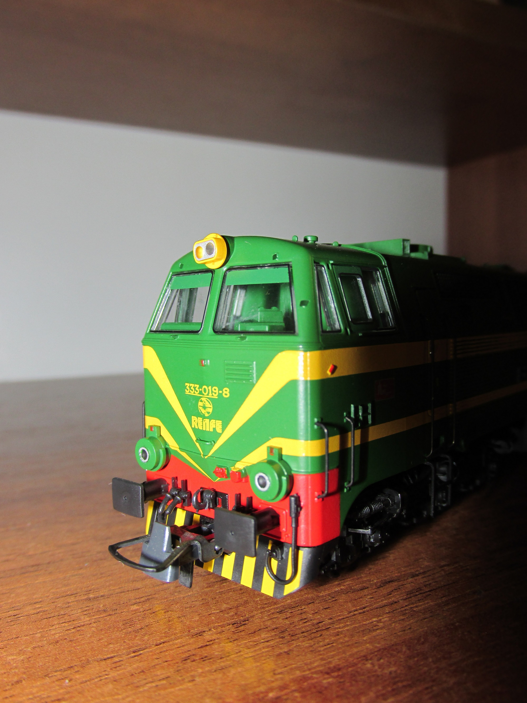 Всем привет! Закончив длительное повествование о "Людмилах", переходим к обзору тепловозов зарубежных прототипов. Короче - группа "чужие". Начну с недавнего приобретения - тепловоз типа 333 Испанских железных дорог RENFE. Прототип строился в 1974-76 годах и представляет собой мощный шестиосный тепловоз мощностью 3300 л.с. с электрической передачей переменно-постоянного тока и конструкционной скоростью 146 км/ч. Проектируя этот тепловоз, испанцы предпочли использовать качественные, проверенные временем комплектующие (дизель-генератор, тяговые электродвигатели, электрическую аппаратуру) американской фирмы GM (EMD), а кузов и экипажную часть выполнили по своему усмотрению. Получился довольно удачный, мощный и красивый тепловоз, который эксплуатировался на RENFE как с пассажирскими, так и с грузовыми поездами. По тяговым параметрам машина очень близка к "Людмиле" BR131 - стартовое тяговое усилие составляет 33,0 тс., длительная сила тяги - 27,6 тс. Локомотивы серии 333 прожили долгую жизнь, часть из них была подвергнута модернизации и работает до сих пор.