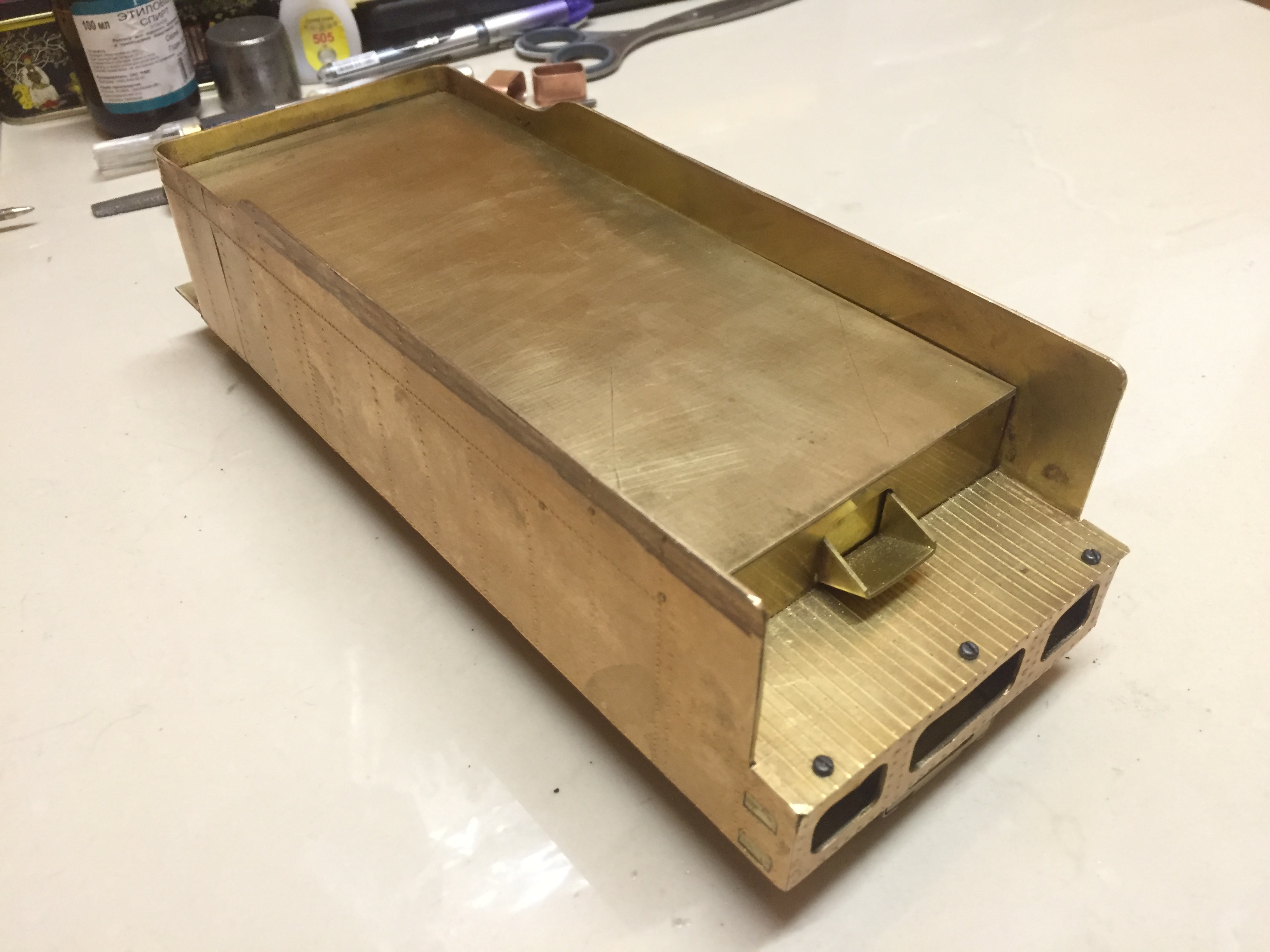 Дальше палуба бака. Самая интересная деталь здесь - горловина. Была бы круглого сечения, то все просто - рассверлил бы ступенчатым сверлом по разметке и усьо. Но вся проблема в том что прямоугольная она с радиусными углами. Такую из отдельных деталей гнуть и паять долго и не технологично. Потом при пайке крышки с навесами стенки могут развалиться.