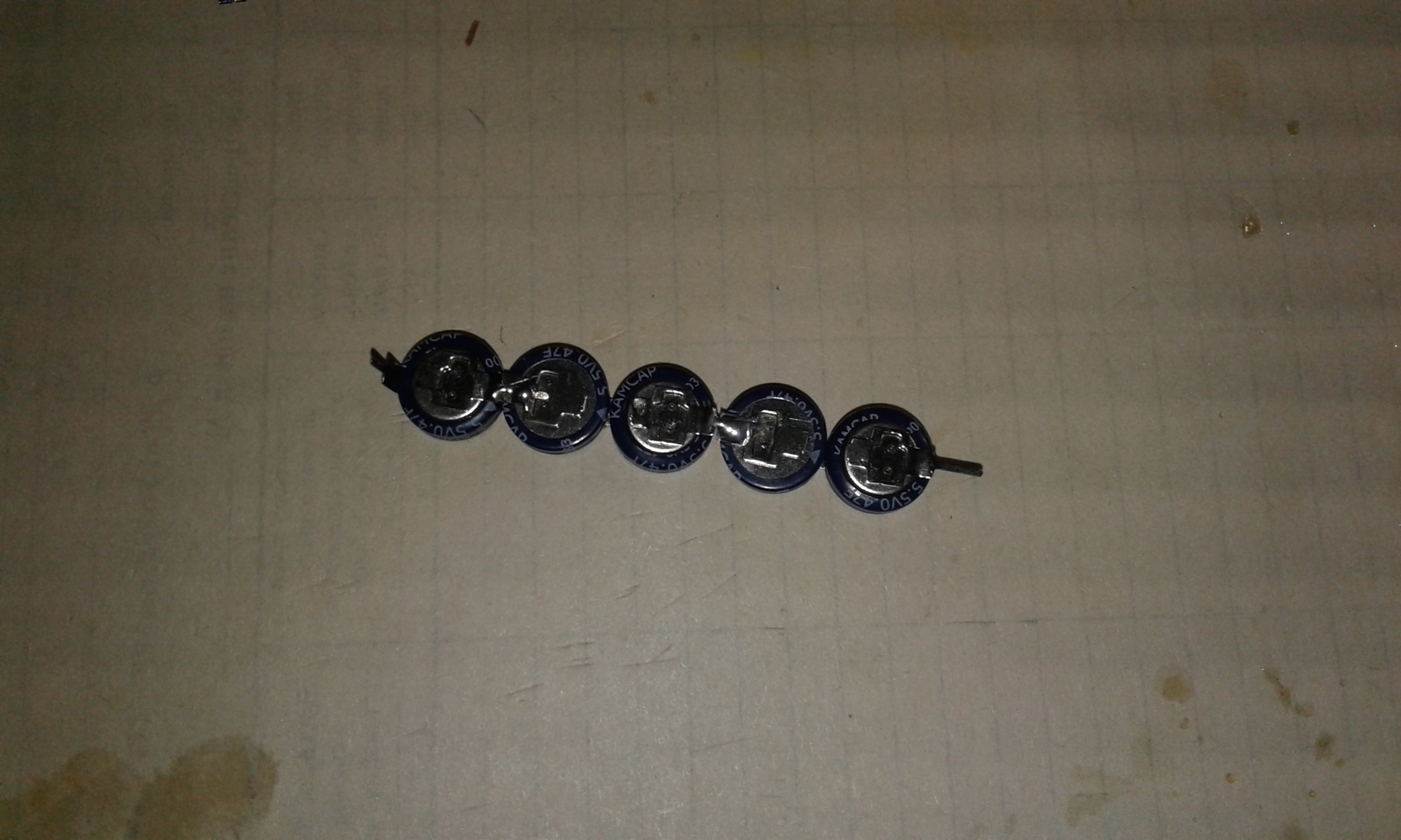 Объединил 5 штук в последовательно в батарею. Чтоб избежать использования балласта и упростить схему, ионисторы были отобраны по ESR и использованы в избыточном количестве (5 вместо 4):