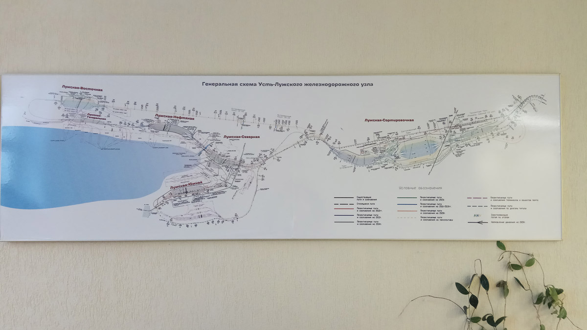 6. Схема расположения парков станции. Она, конечно, дает лишь приблизительное понимание масштаба. 7. Общая площадь застройки Усть-Лужского железнодорожного узла составляет 930 га, из них 270 га занимает сортировочная система станции Лужская. Общая протяженность путей Усть-Лужского железнодорожного узла на полное развитие будет составлять более 300 км. Сегодня Усть-Лужский железнодорожный узел представляет собой единую железнодорожную станцию Лужская, в её границах для обслуживания грузовых терминалов построены три парка: Лужская-Северная, Лужская-Южная и Лужская-Нефтяная. 8. — Парк Лужская-Северная обслуживает комплекс перегрузки угля, универсальный перегрузочный комплекс, а также комплекс по перегрузке