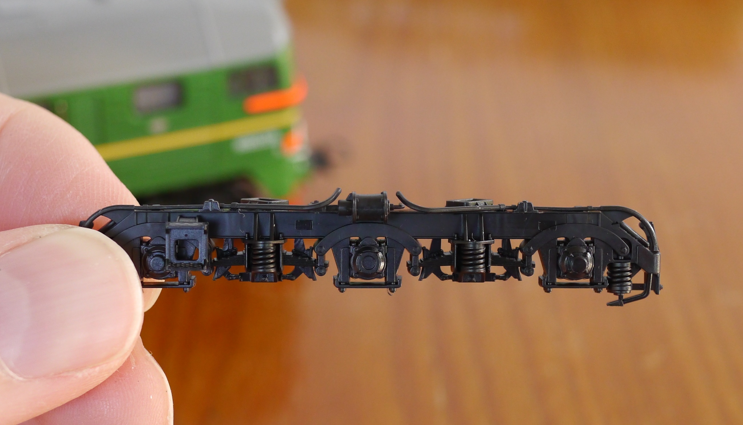 Обе секции тепловоза – моторные. Ходовая часть в целом осталась такой же (рама, редукторы, двигатель). А вот над электрической составляющей поработали. Изменилась печатная плата. Ламповое освещение заменили на диодное. Разъем декодера с 8-пин поменяли на 16-пин в одной секции, и 21-пин во второй (?). Честно признаюсь: в оцифровке моделей понимаю чуть менее, чем ничего. Потому пускай знающие товарищи подскажут, хорошо это или плохо.