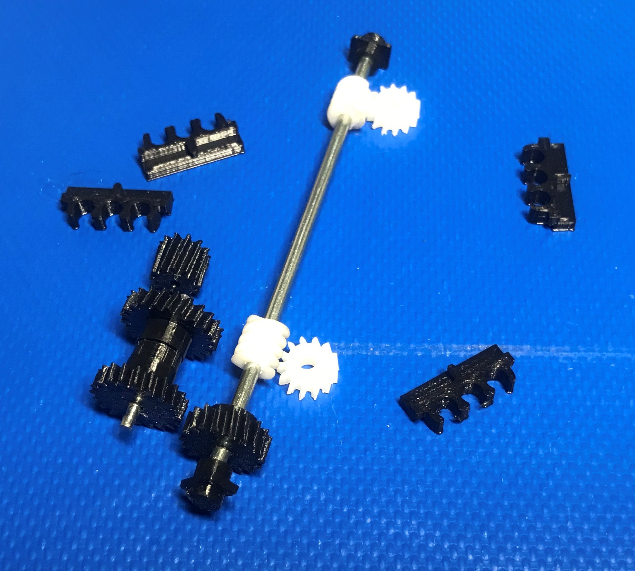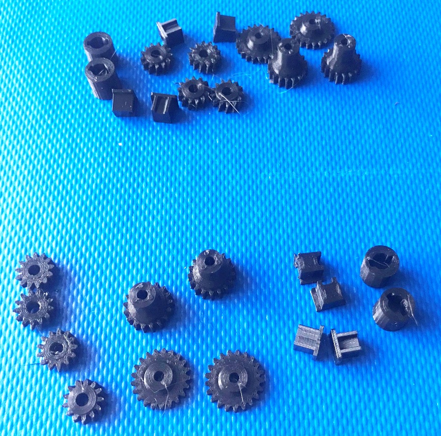 Готую наботи шестерен для локомотивів Бр-110, Бр-120, Бр-130. Будуть змішані - деякі деталі з фотополімеру. Поки що демонструю шестерні, зроблені з РЕТg пластику. Є шестерні на колпари з вісью 2,0мм, так щр можливо використовувати вагонні колпари для обмоторювання локомотивів.