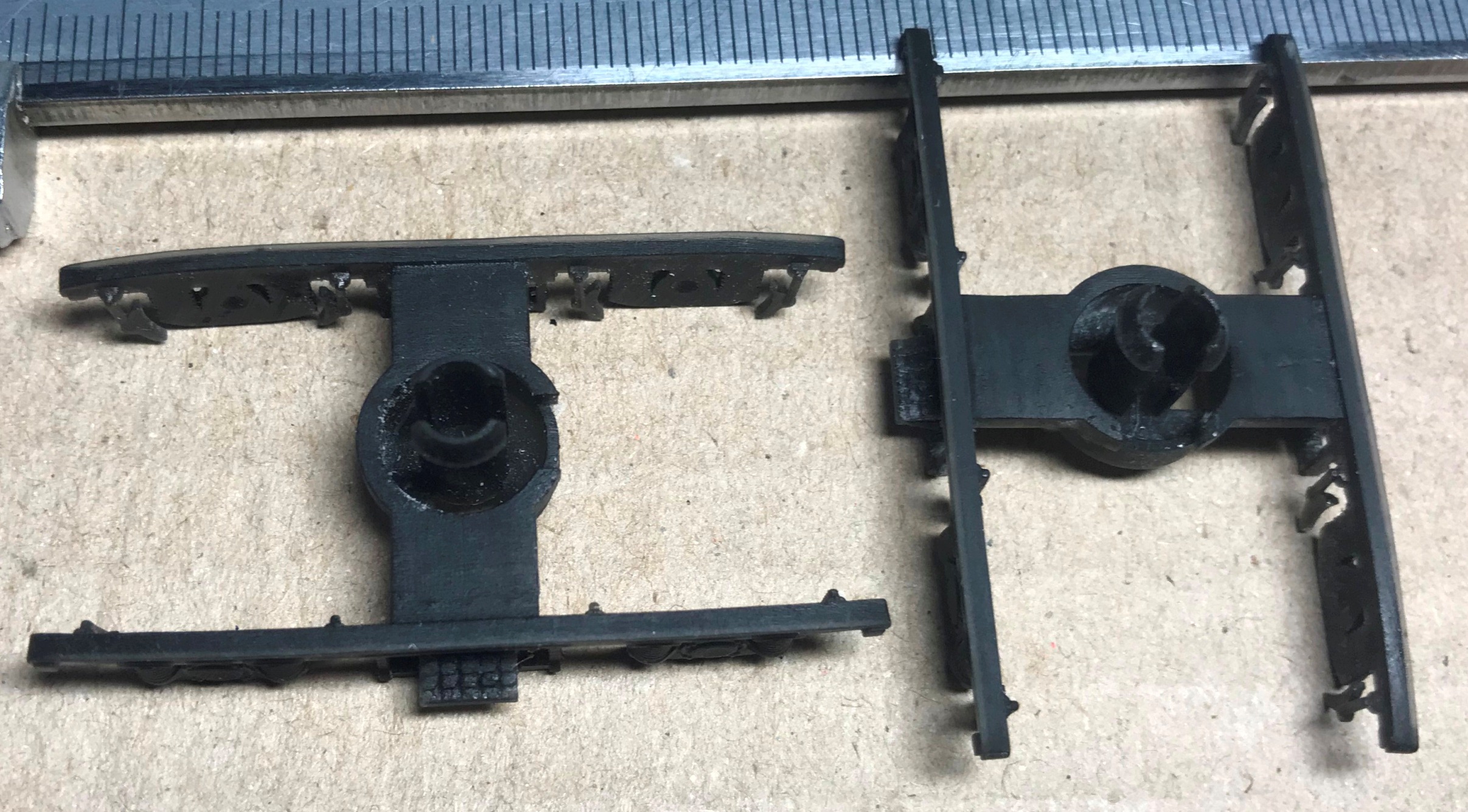 Боковини візочків 4-осного тендера до паровоза ОВ. Візочки вагонів типу "Даймонд". Зроблені з регулюємою довжиною зчепки, по потребі. Дахи до тепловозів BR-110 (V-100) старого PIKO. Ще дефлектори Чеснокова діаметром 320мм для вагонів і зчепки для заміни гачка Флешман на петлю Пико двох видів. Зчепки покажу згодом, як встановлю петлі.
