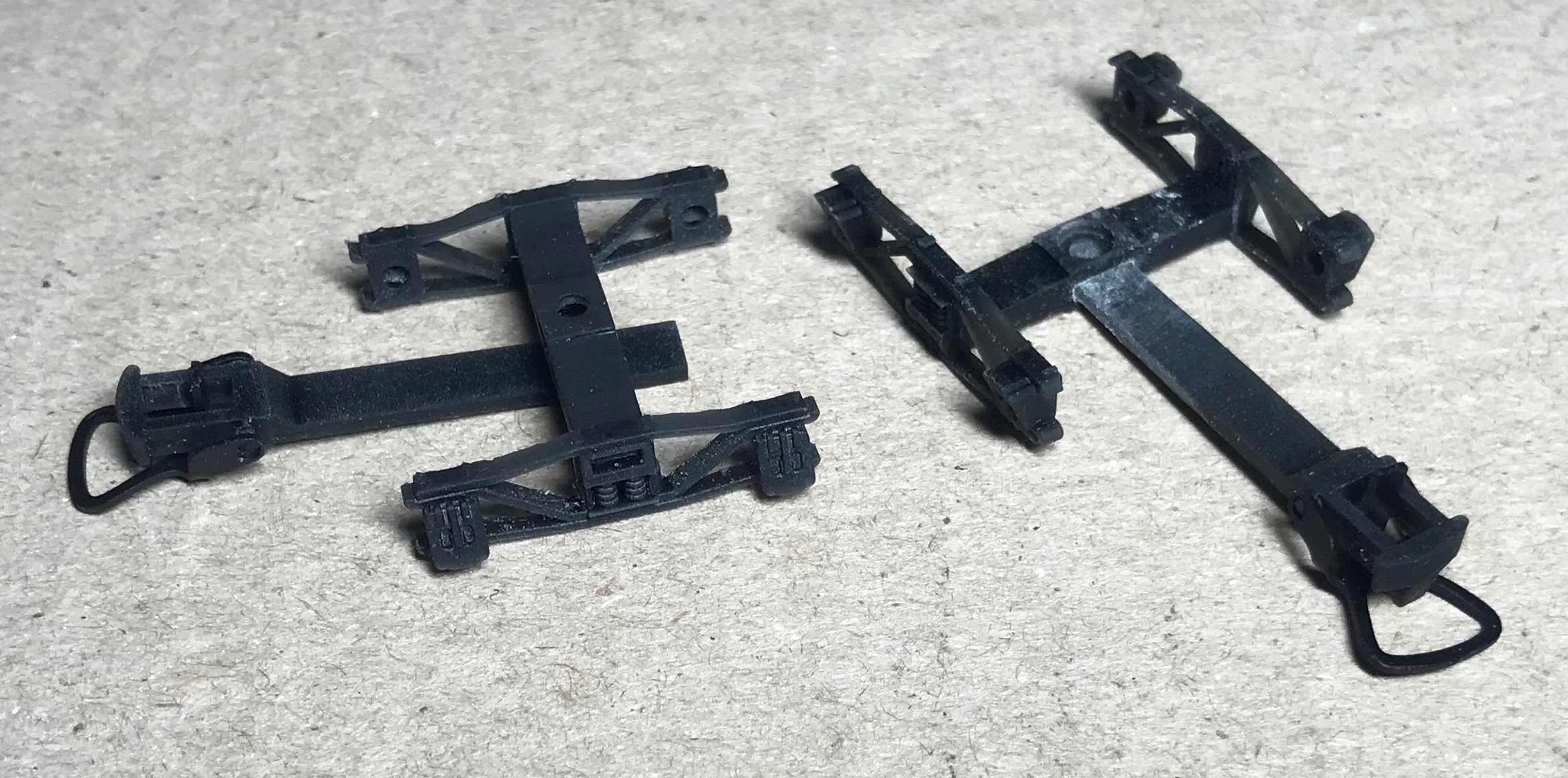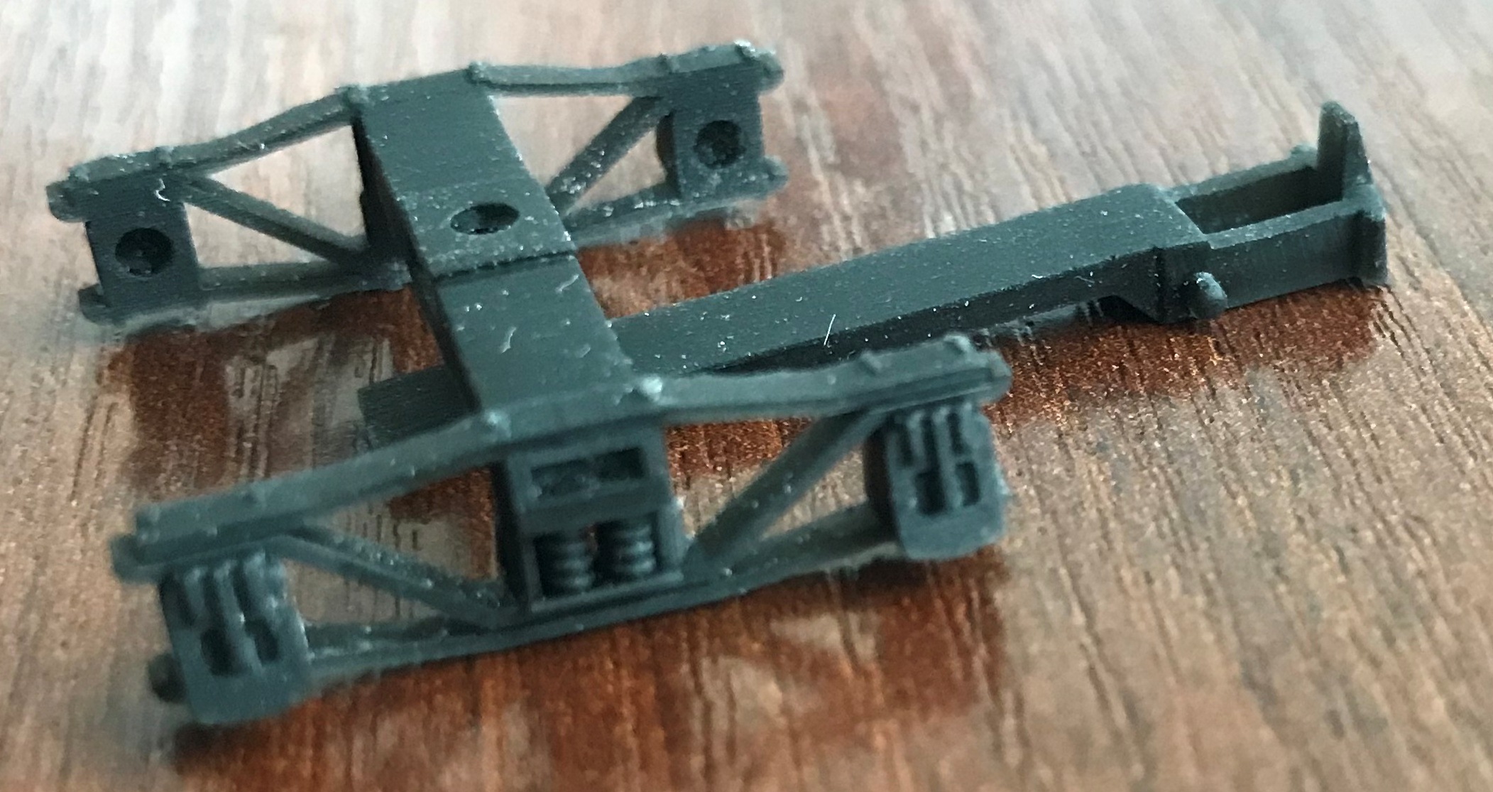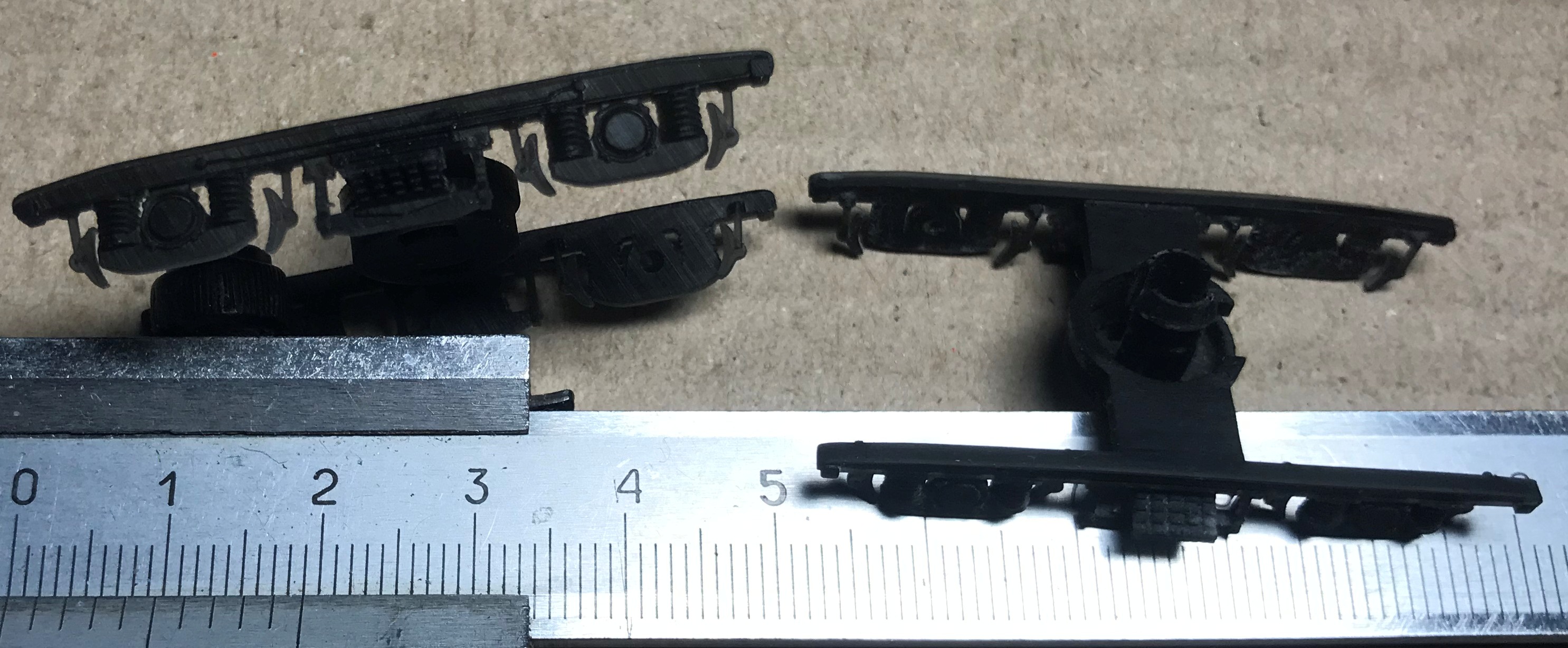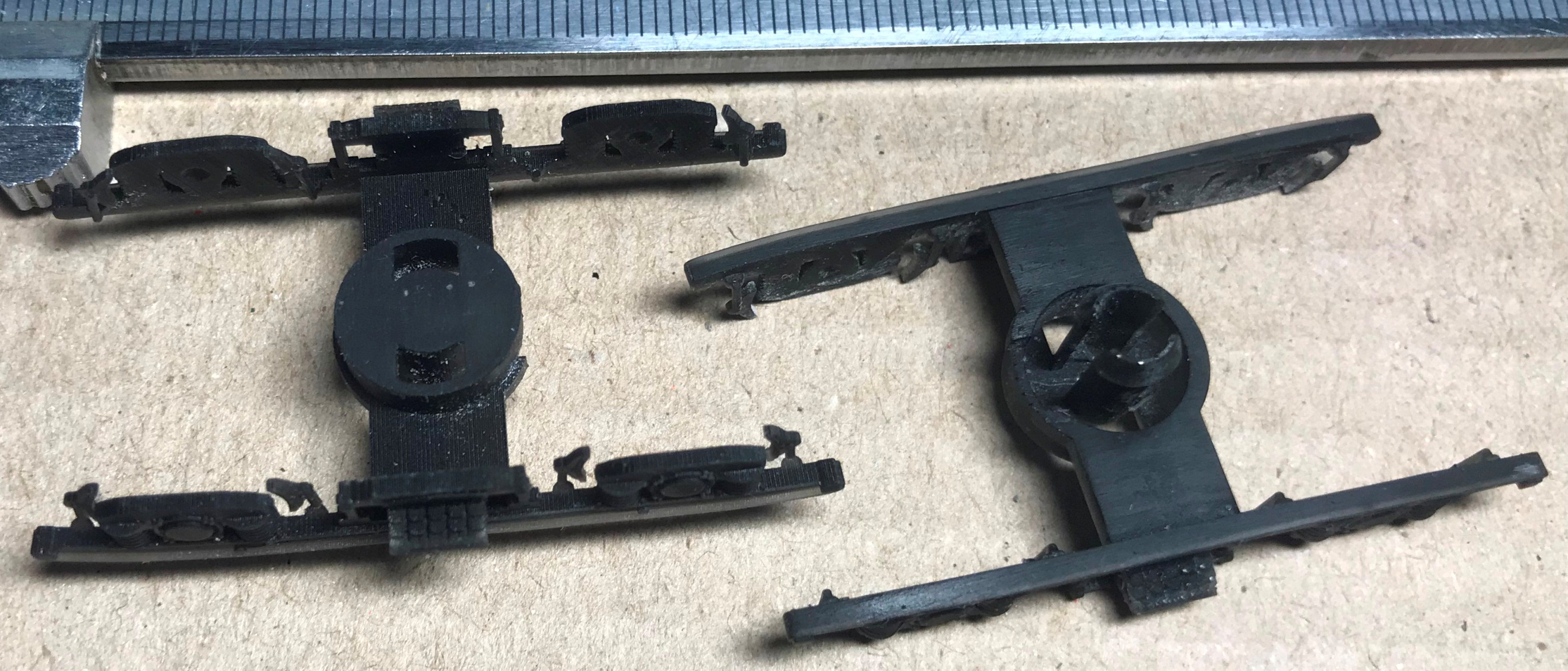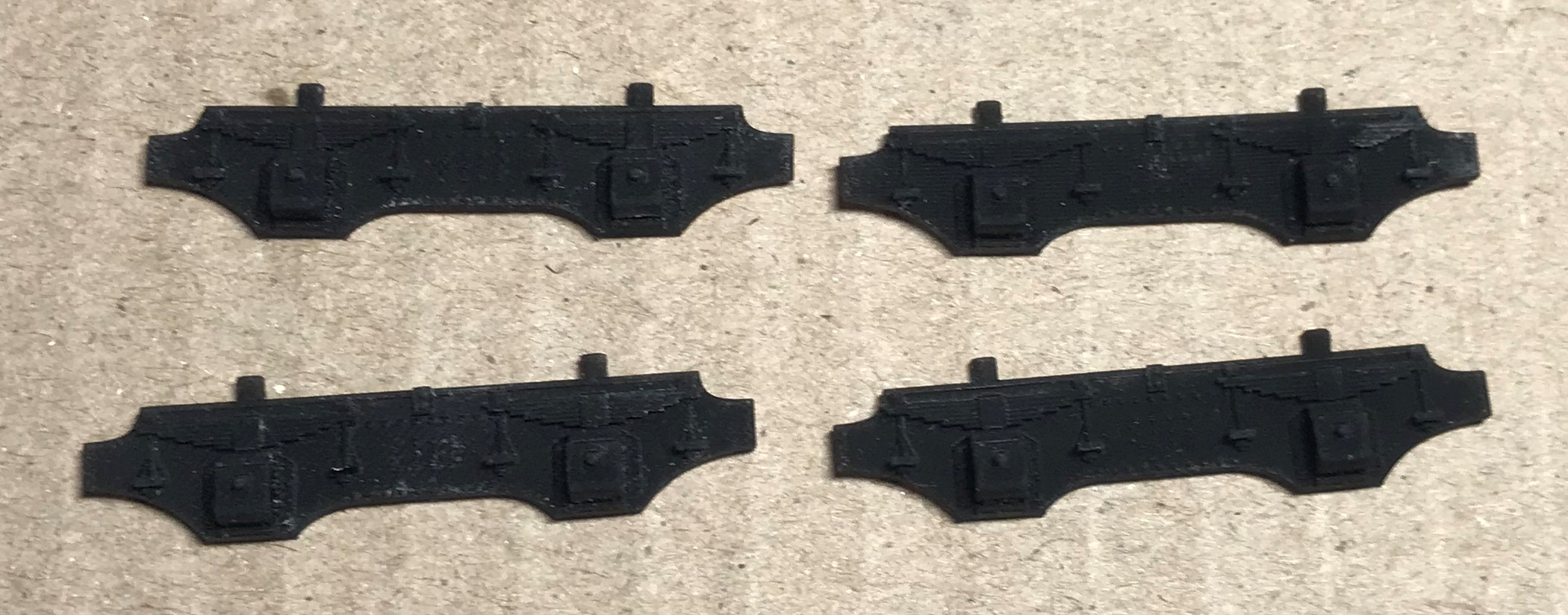 Боковини візочків 4-осного тендера до паровоза ОВ. Візочки вагонів типу "Даймонд". Зроблені з регулюємою довжиною зчепки, по потребі. Дахи до тепловозів BR-110 (V-100) старого PIKO. Ще дефлектори Чеснокова діаметром 320мм для вагонів і зчепки для заміни гачка Флешман на петлю Пико двох видів. Зчепки покажу згодом, як встановлю петлі.