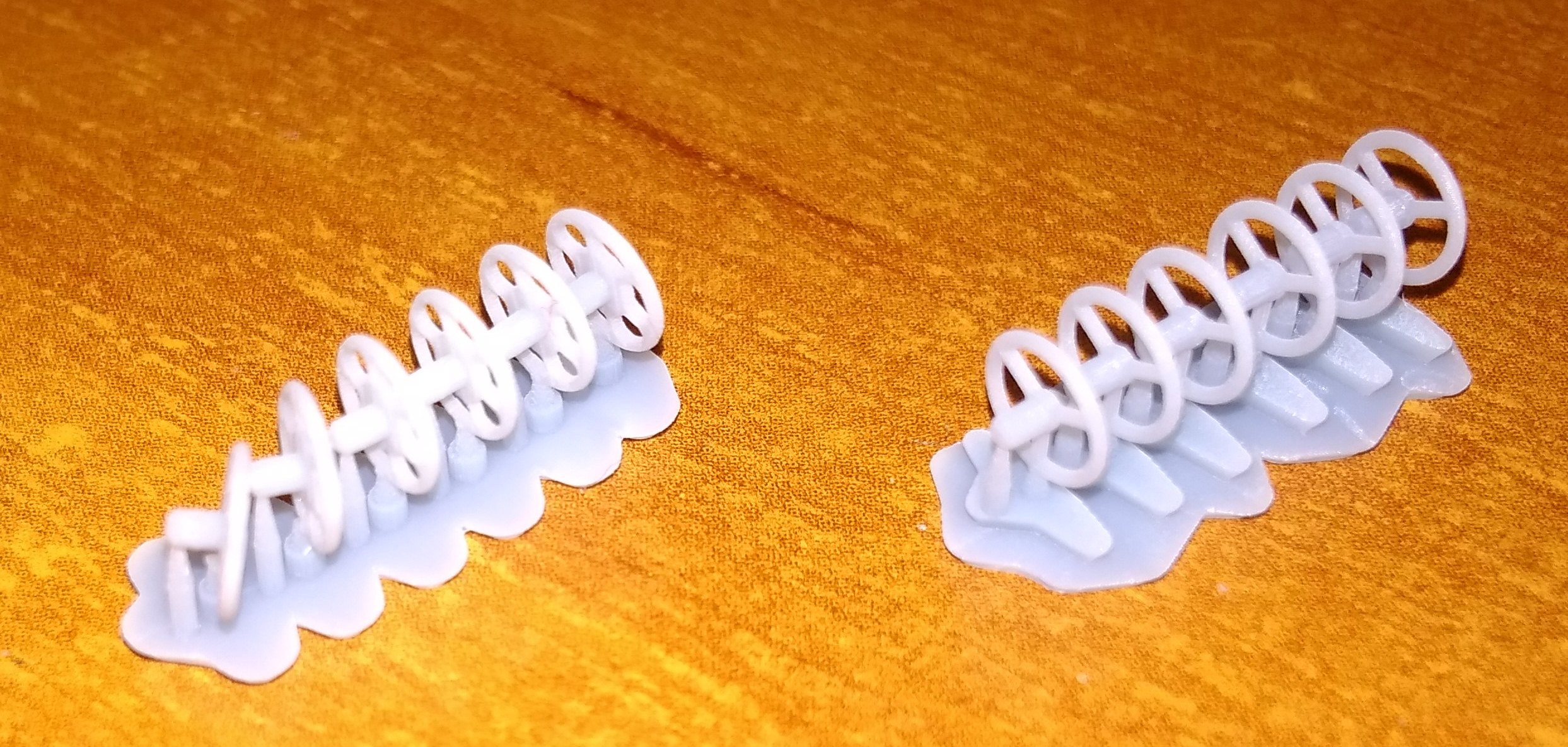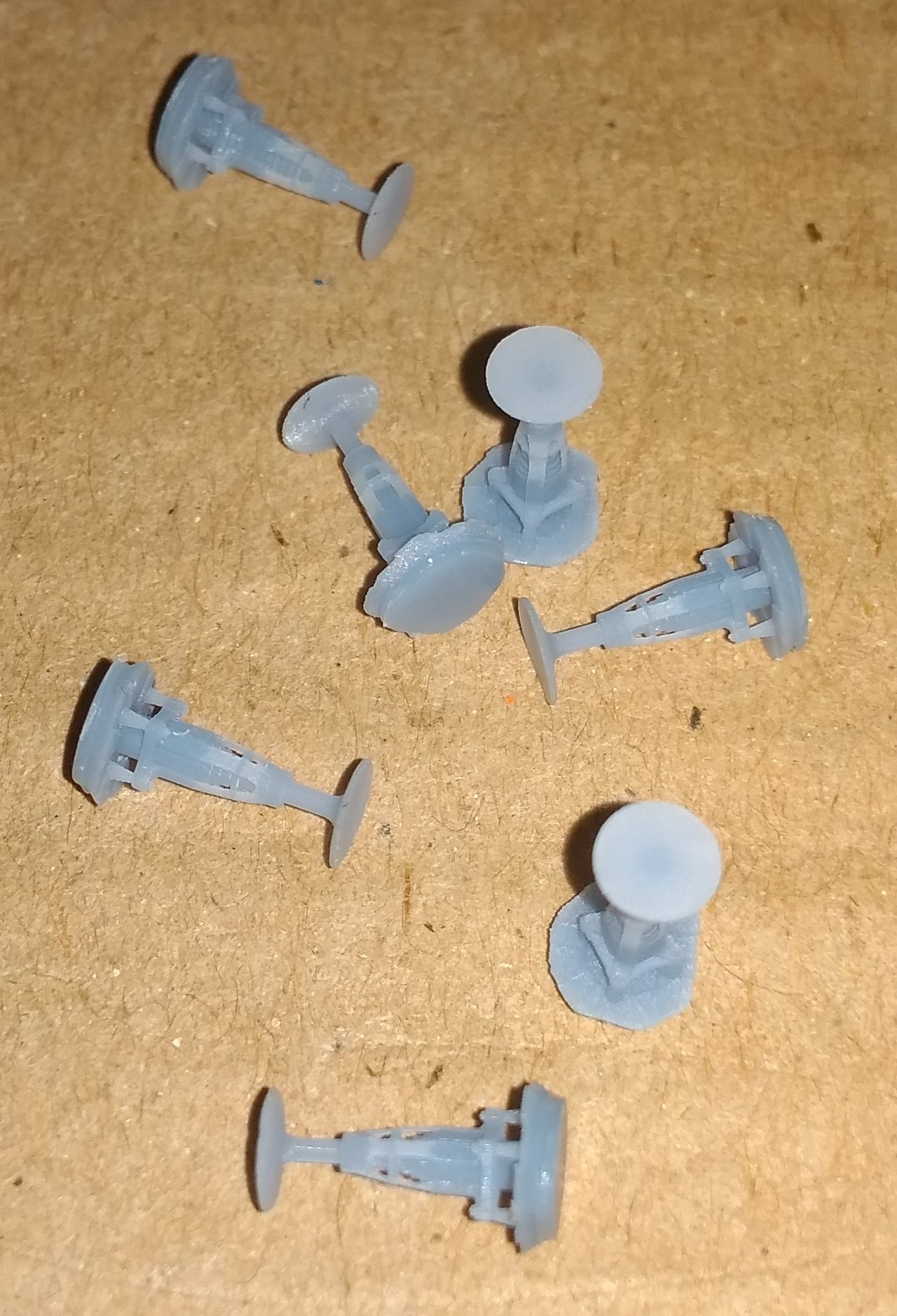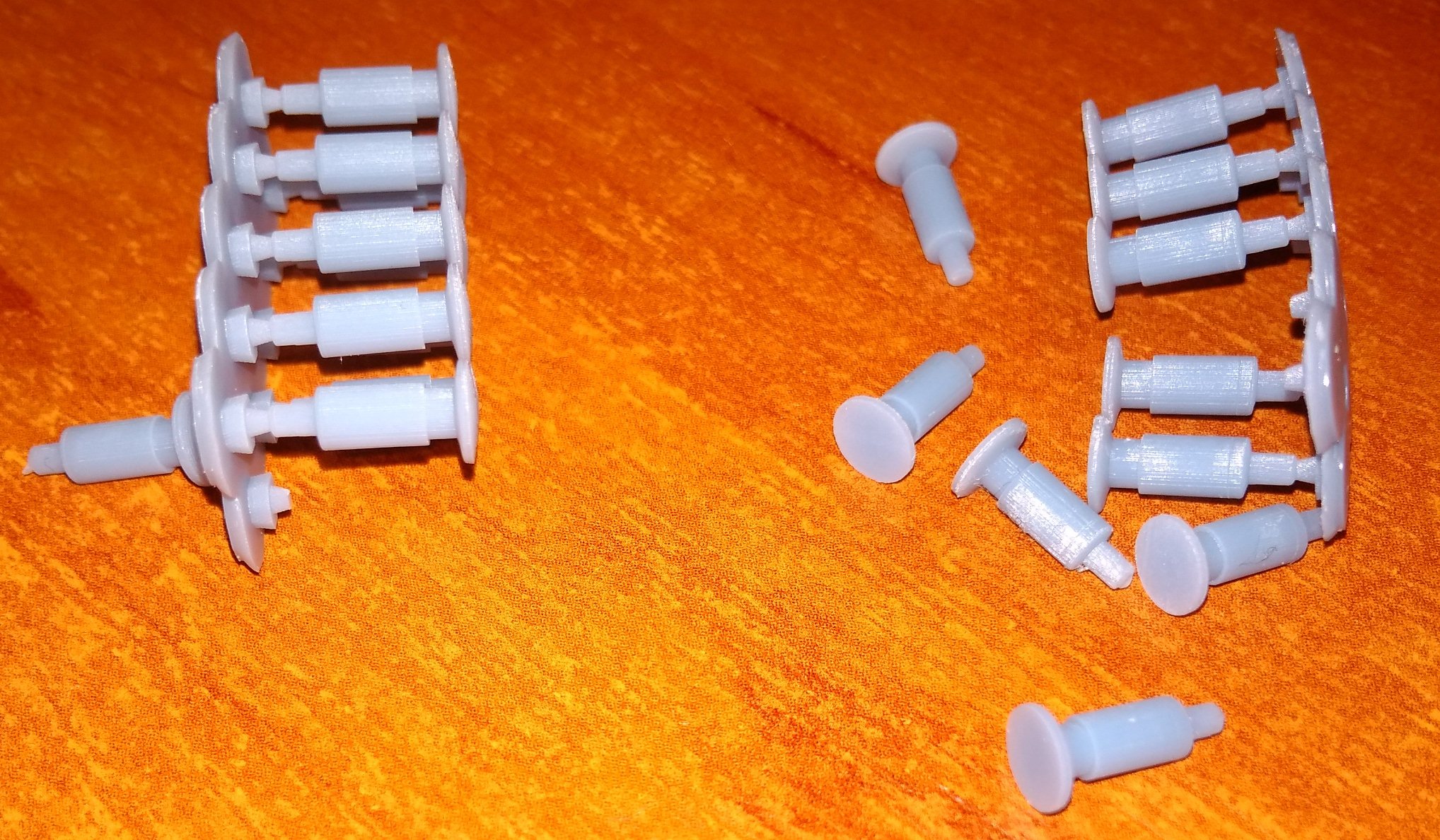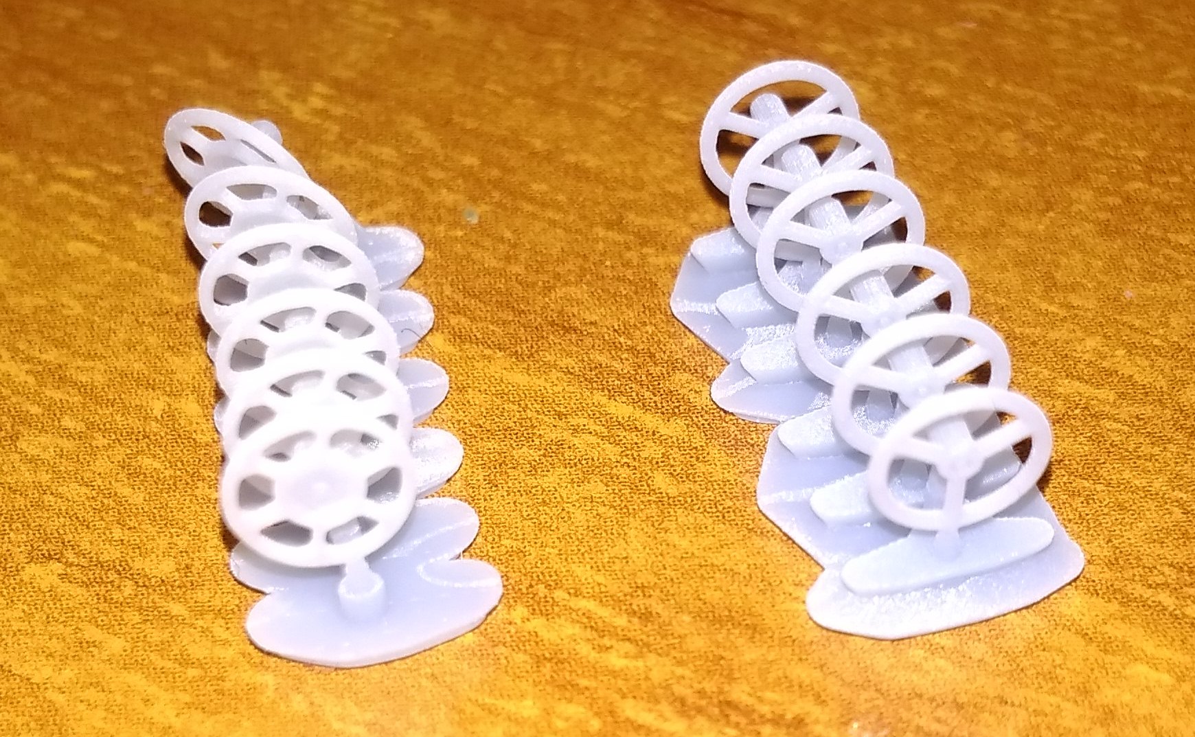 Штурвалы для грузовых вагонов. Трёхспицевые и шестиспицевые. Буферы для грузовых вагонов Пико. Ломаются часто, в вытачивать вручную уже надоело. Правые (с выпуклой тарелкой) и левые (с плоской). И скрин буферов из прошлого поста.