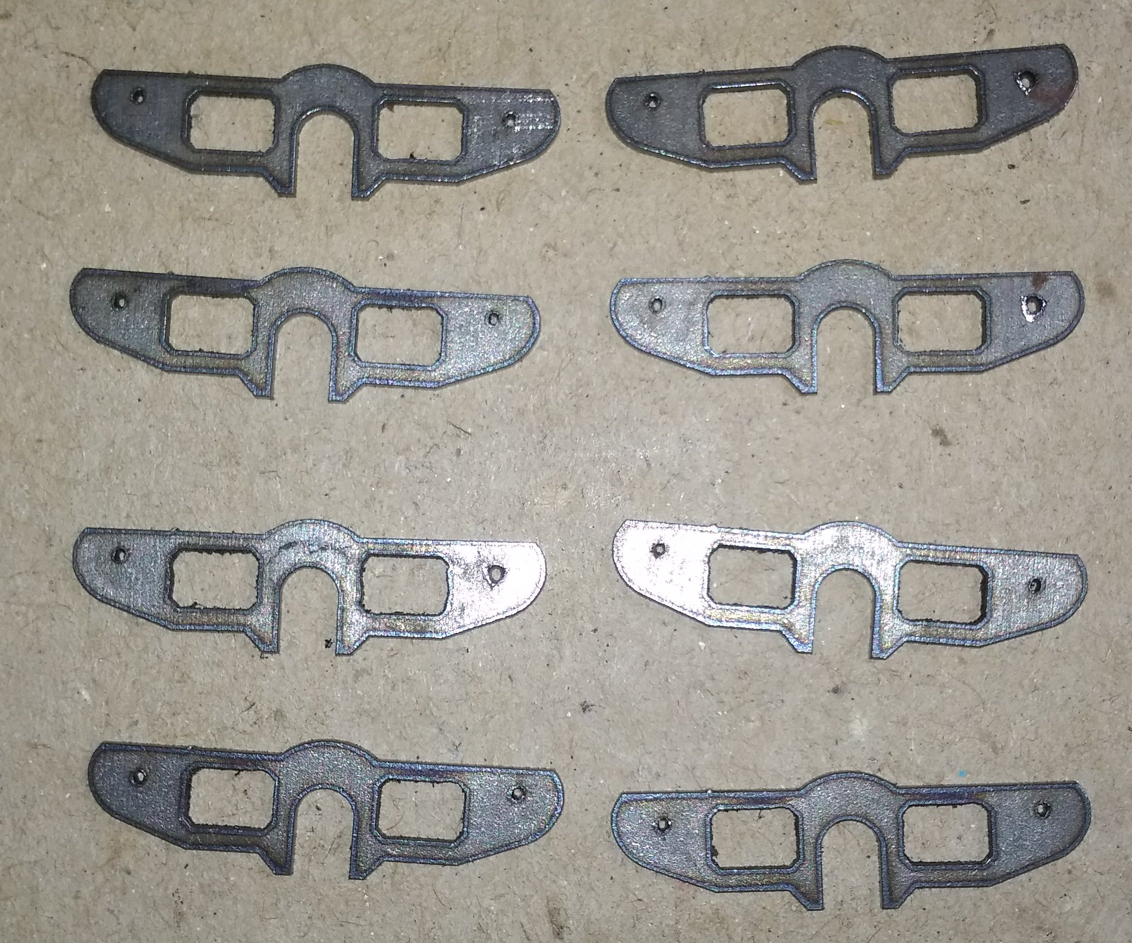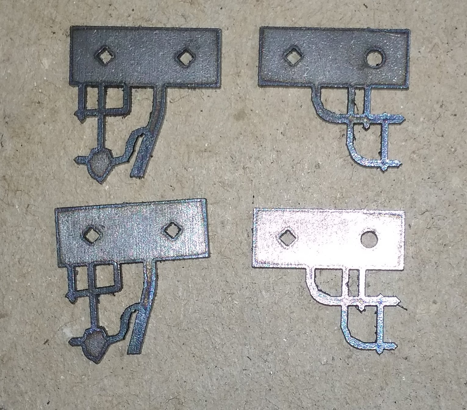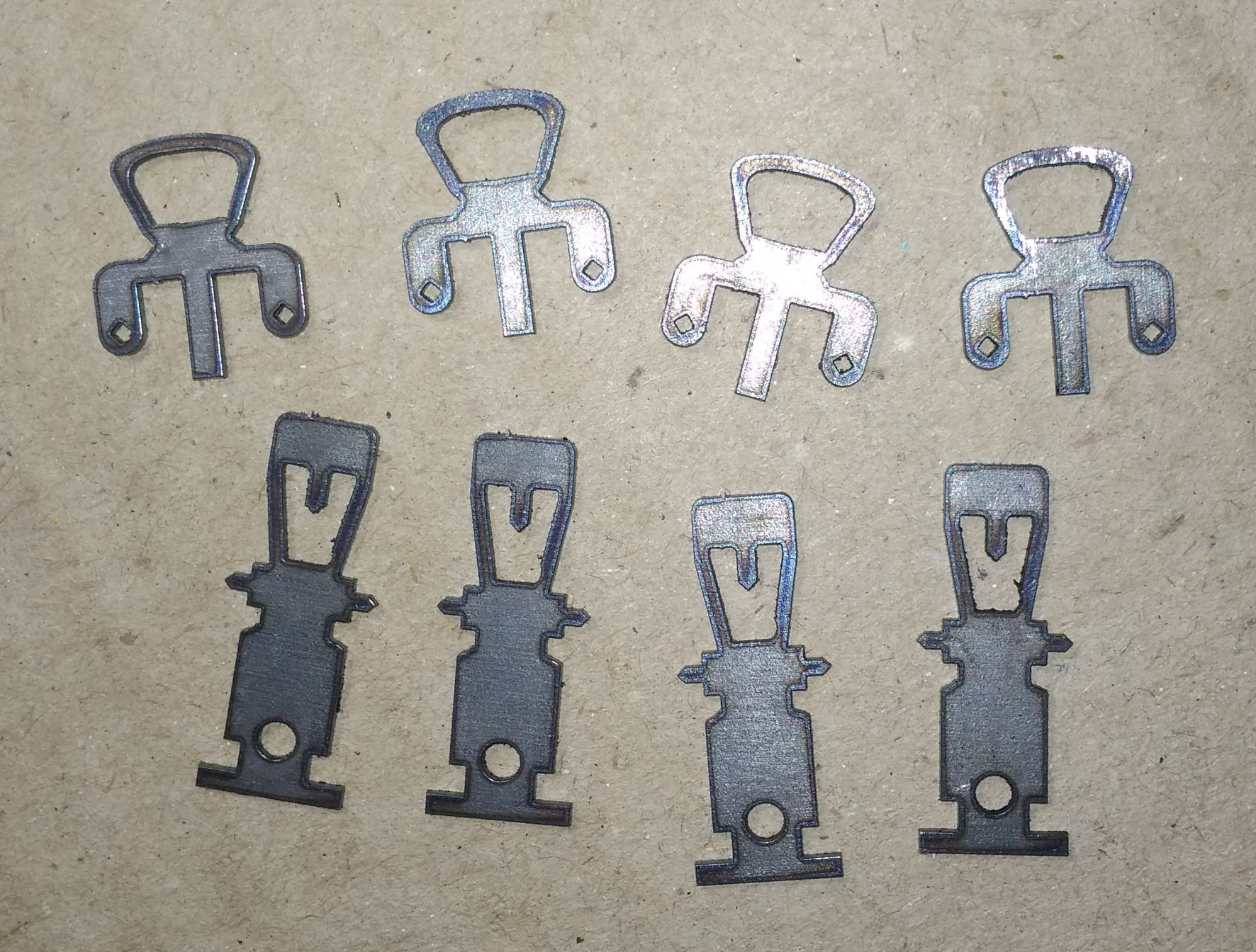 Удалось сделать немного деталей лазерной резкой. Пока выкладваю так сказать, с пылу- с жару. Будут ещё обрабатываться, химически черниться (которые будут черные) и краситься.