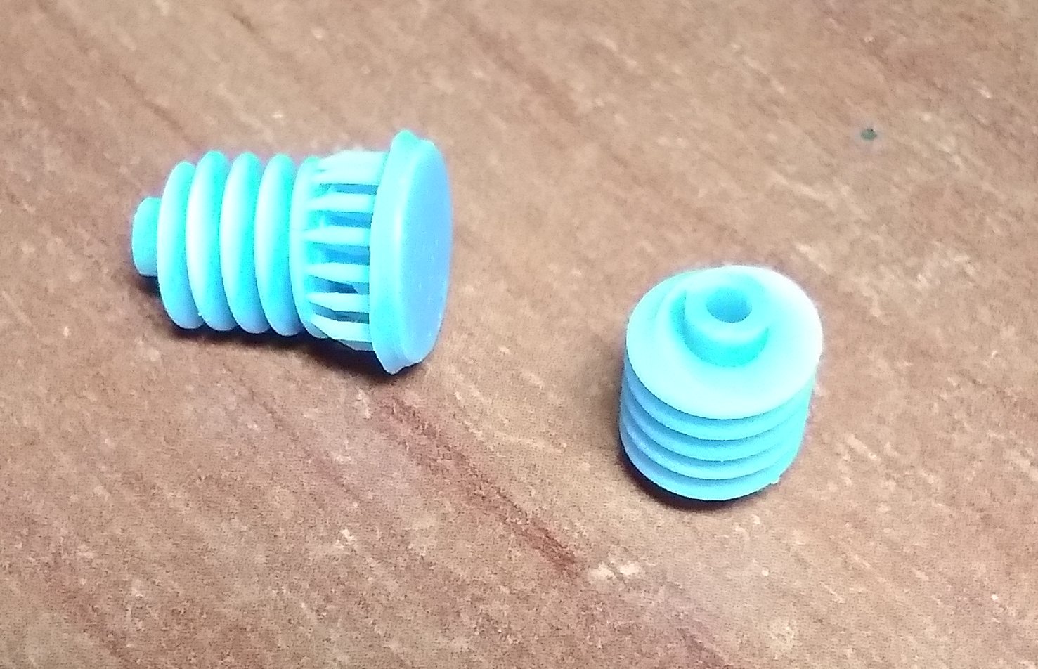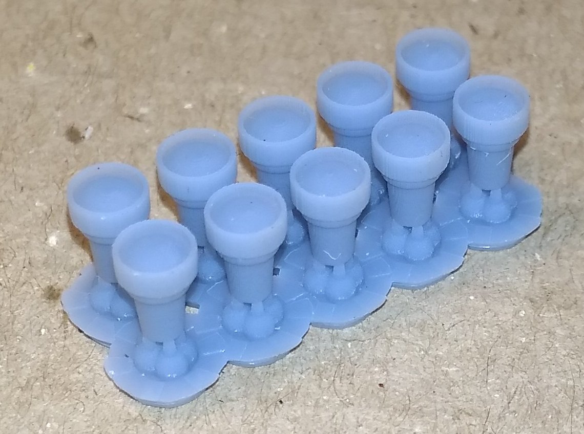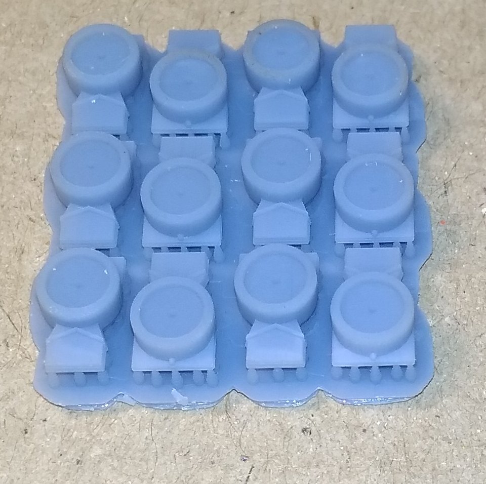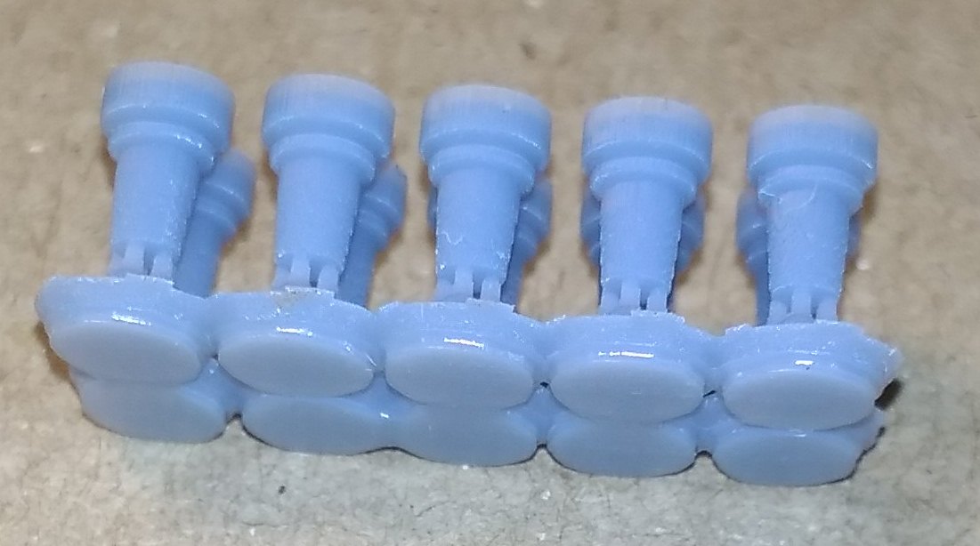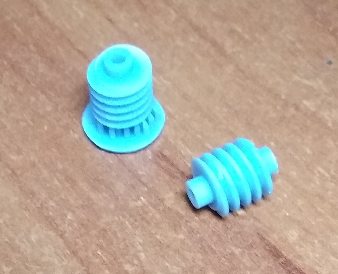 1. Нижняя крышка для локомотивов Пико Нохаб и французского скоростного электровоза CC7101. 2. Тарелки буферов для Роко. Плоские и выпуклые. 3. Вставная часть буферов современных вагонов для Лима. Для других производителей тоже должно подойти. 4. Червячная шестерня диаметром 8 мм с модулем 5. Для тепловозов Механо. Реставрирую такой, вот и пришлось сделать взамен утерянной. В основном предлагают все диаметром 6 мм, а это мало. Думаю. можно будет использовать и как насадку на вал двигателя, для прямой передачи на колпары. Больший диаметр позволяет чуть выше расположить двигатель. И, наконец, просто для показа тут, дали колесо от полуторки в масштабе 1:87. Диаметр 10,6 мм. Разработка не моя, в этом случае. Без вспышки при люминисцентном освещении получается какого-то бирюзового цвета. Но на самом деле, серый пластик.