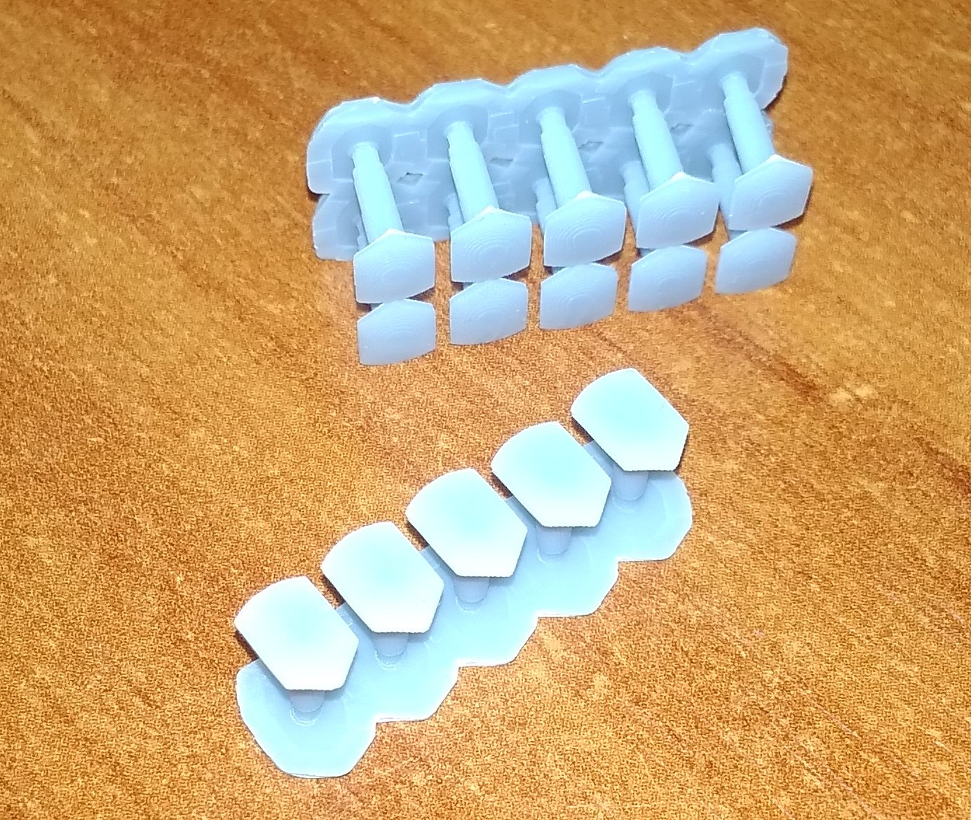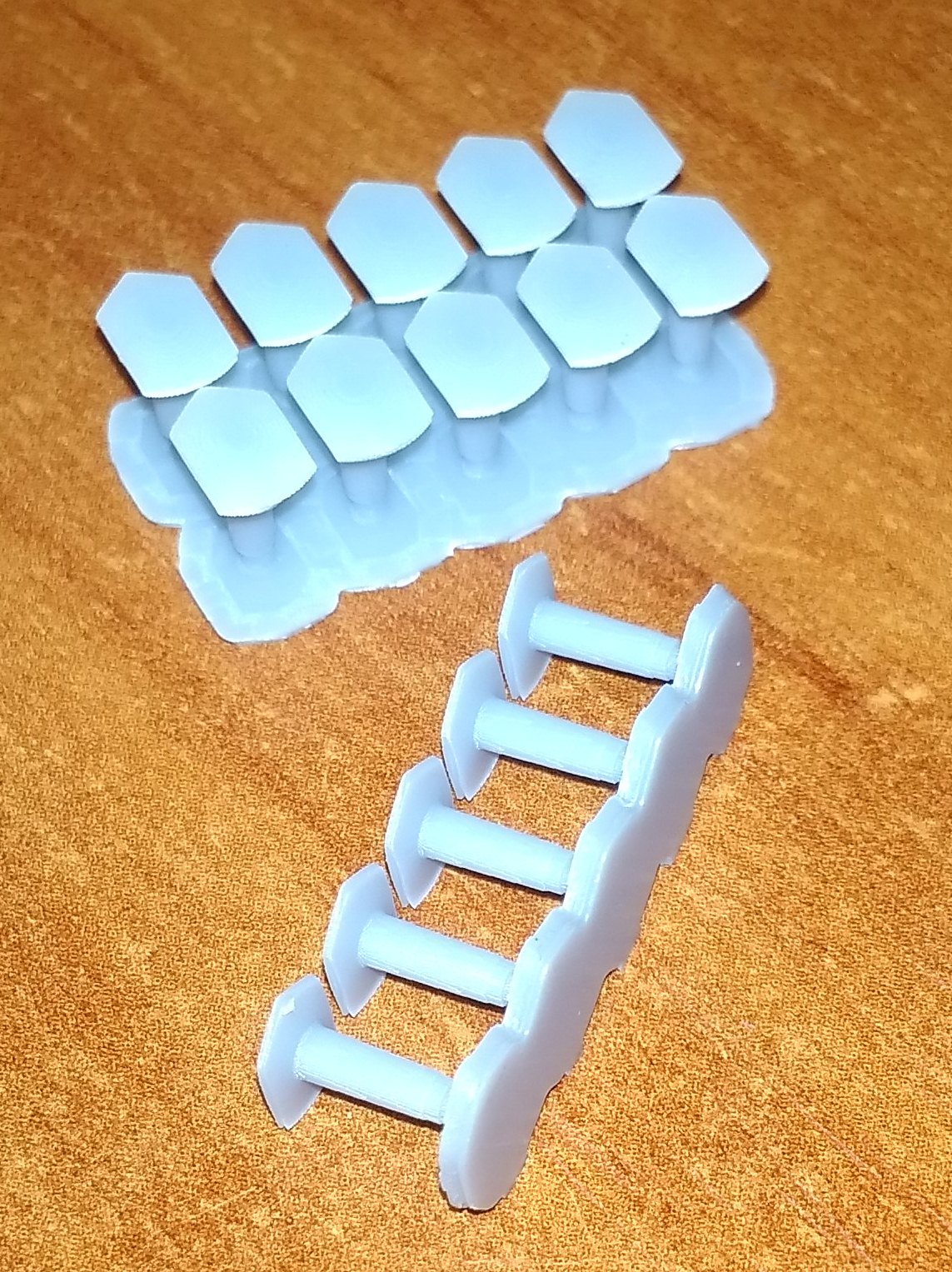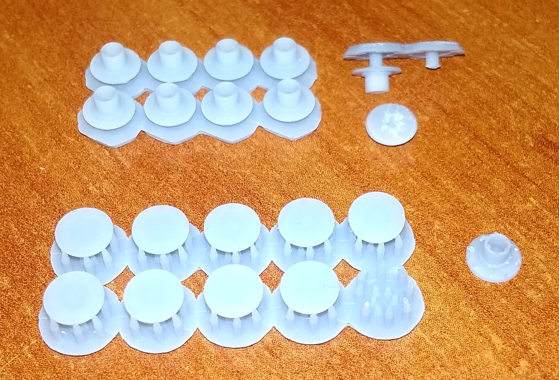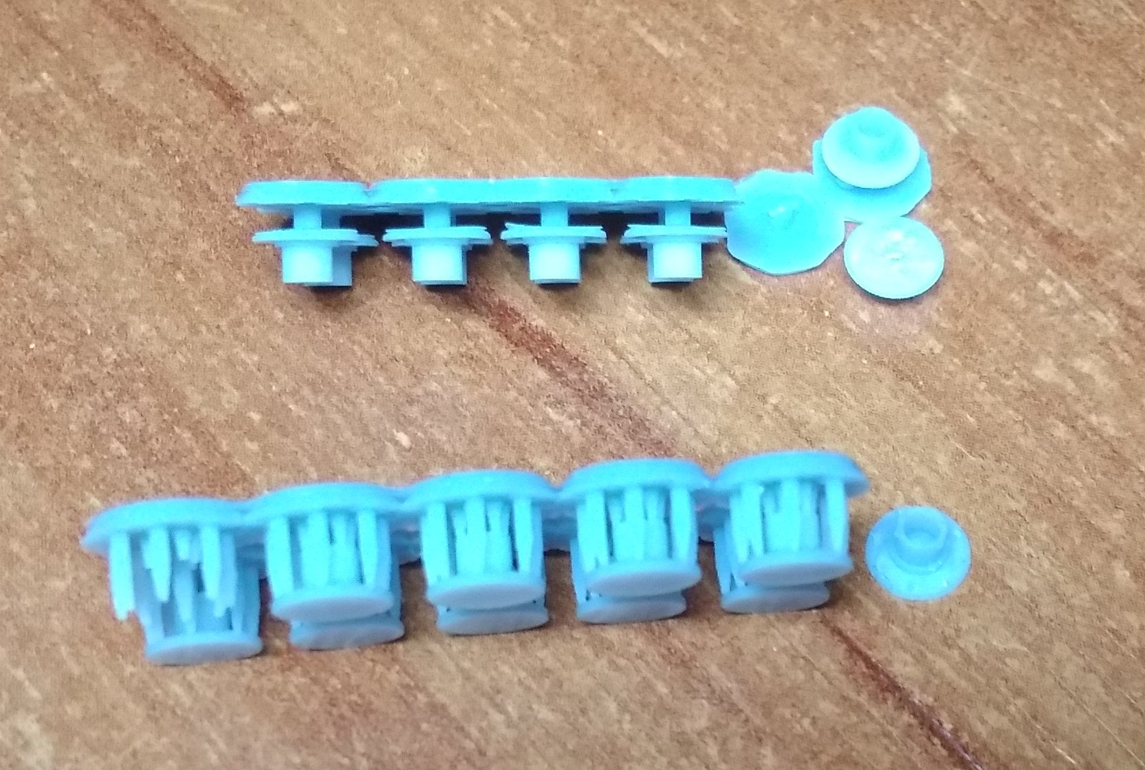 1. Нижняя крышка для локомотивов Пико Нохаб и французского скоростного электровоза CC7101. 2. Тарелки буферов для Роко. Плоские и выпуклые. 3. Вставная часть буферов современных вагонов для Лима. Для других производителей тоже должно подойти. 4. Червячная шестерня диаметром 8 мм с модулем 5. Для тепловозов Механо. Реставрирую такой, вот и пришлось сделать взамен утерянной. В основном предлагают все диаметром 6 мм, а это мало. Думаю. можно будет использовать и как насадку на вал двигателя, для прямой передачи на колпары. Больший диаметр позволяет чуть выше расположить двигатель. И, наконец, просто для показа тут, дали колесо от полуторки в масштабе 1:87. Диаметр 10,6 мм. Разработка не моя, в этом случае. Без вспышки при люминисцентном освещении получается какого-то бирюзового цвета. Но на самом деле, серый пластик.
