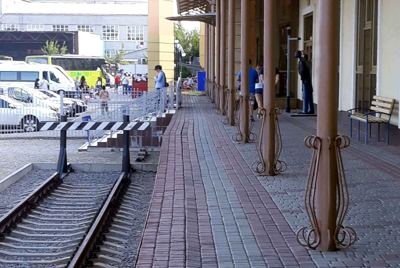 Высокая платформа у здания (здание - бывший багажный терминал) - осыпается (на фото видно искривление влево от прямой), колокол, который висел на одной из инсталляций - ушел в неизвестном направлении и заменен на пластиковое ведро. То, что экспонаты, для которых оставлялась пустой первая платформа, до музея за семь лет так и не доехали - вовсе не вызывает удивления.