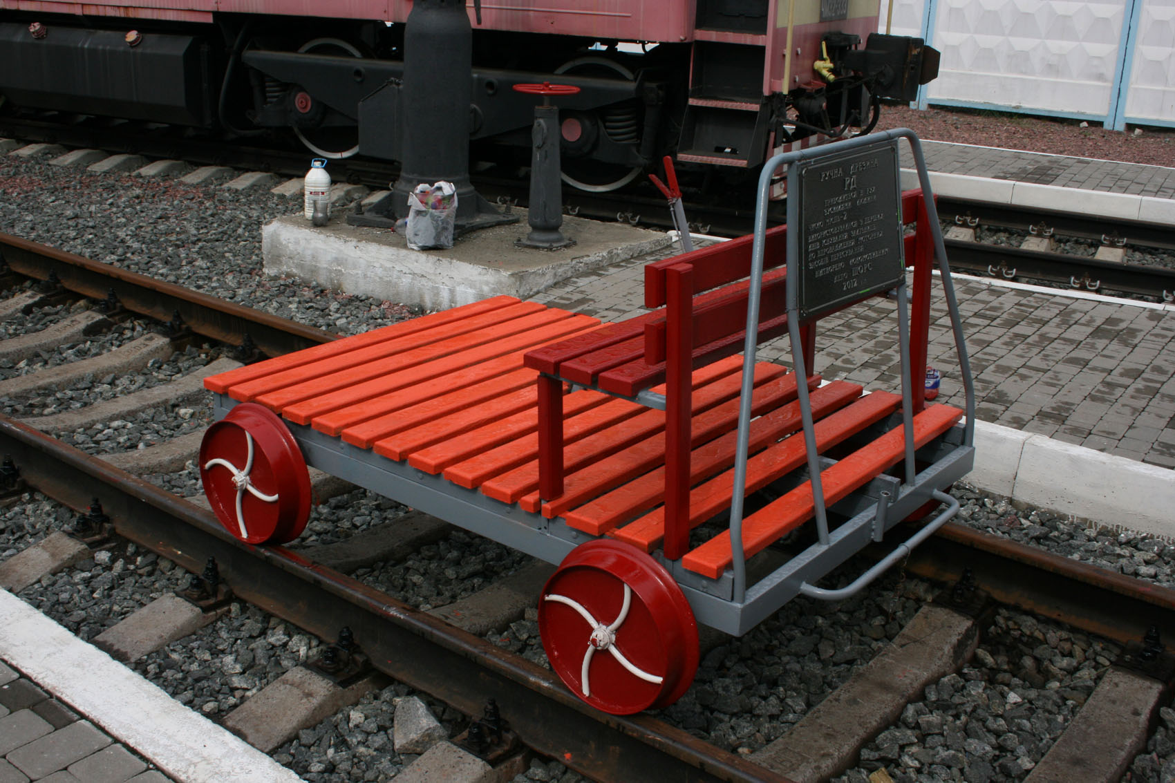 Начнем от печки, то есть от вокзала: совершенно уникальные конструкции путевых ветродуев, то.е. очистителей путей, про которые в Сети ничего, кроме скупых слов про то, что на одном реактивный двигатель от МиГ-15. Табличек не припомню, дело было не в то, первое посещение, а в этом году и снимал с перрона Бориспольского Аэроэкспресса. Узкоколейный путеизмерительный вагон тоже не блещет информацией в Интернете, но спасибо, что его сохранили!