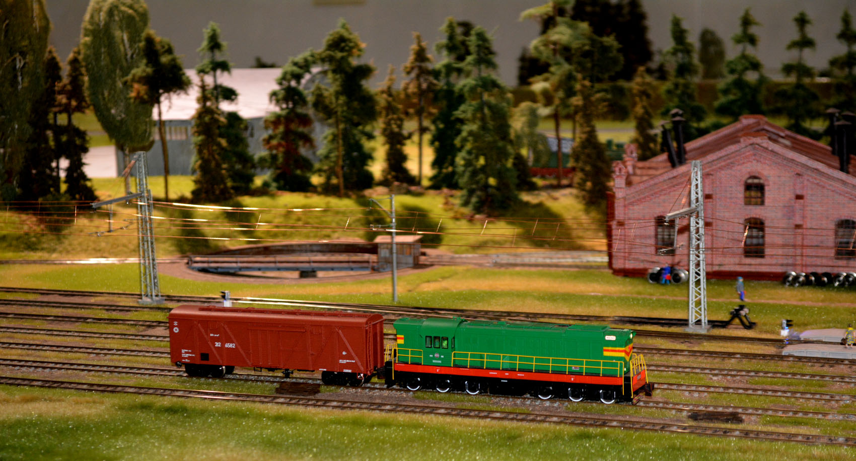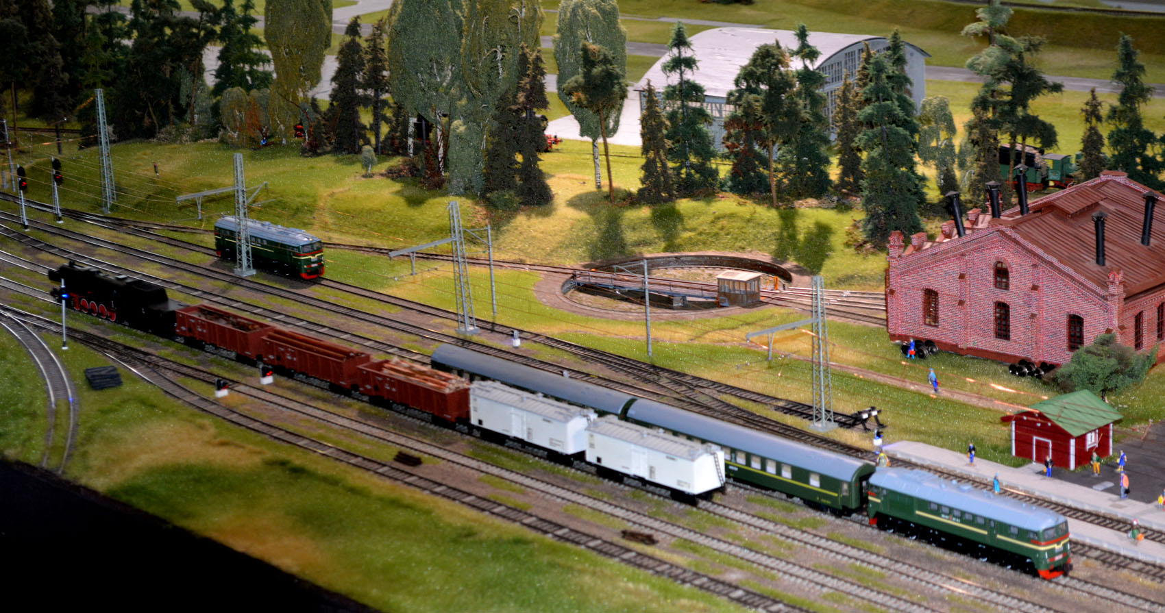 Вот мы и добрались до макета. Он заслуживает более подробного и иллюстративного описания, но уж как могу... Понравилась скромная относительная хронологическая выдержанность. Зрение не позволило рассмотреть, но кажется использованы автосцепки на большинстве ПС, максимально приближенные по копийности и функционалу. Могу ошибаться, далековато от глаз и несколько крупноватыми показались. Масштабность макета осталась за кадром, но наверно это тот минимальный для H0 размер, где "все есть". Да, имеется контактная сеть, хотя электротяги нет. Надеюсь, пока. Все со звуком, обозначены некоторые маневры. Видео не писал, не удержал бы аппарат ровно... Конечно, действо вызвало восторг у зрителей! Мои родственники, далекие от темы люди, получили огромное удовольствие от посещения музея. Только натурные образцы их немного утомили, оно и простительно!