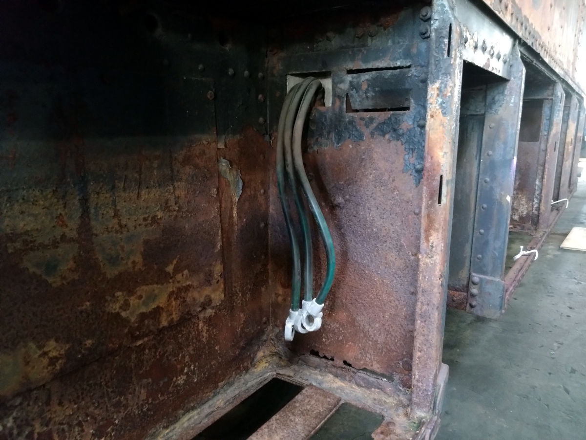 Надо сказать, ракраска Рейхсбана, скорее всего, воссоздана при какой-то попытке отправить вагон в музей. Он имеет явные признаки эксплуатации в послевоенное время (отсутствует будка). Кроме того, если после 1939 года сообщения с Англией не было, то после 1945 - оно стало очень интенсивным, и редкие для континентальной Европы вагоны были очень востребованными, вряд ли он стоял без дела. Также у вагона нет тормозного оборудования, необходимого для эксплуатации в Великобритании: ручного тормоза сбоку и вакуумного автоматического тормоза, есть только "континентальные" тормоза, т.е., по всей видимости, вагон использовался какое-то время в режиме без выхода на международные линии, видимо, для легковесных грузов, и мешавшие английские тормоза просто сняли.