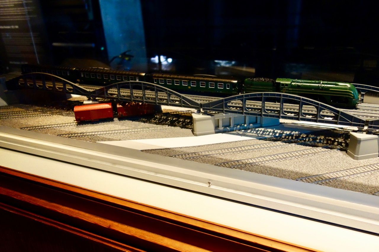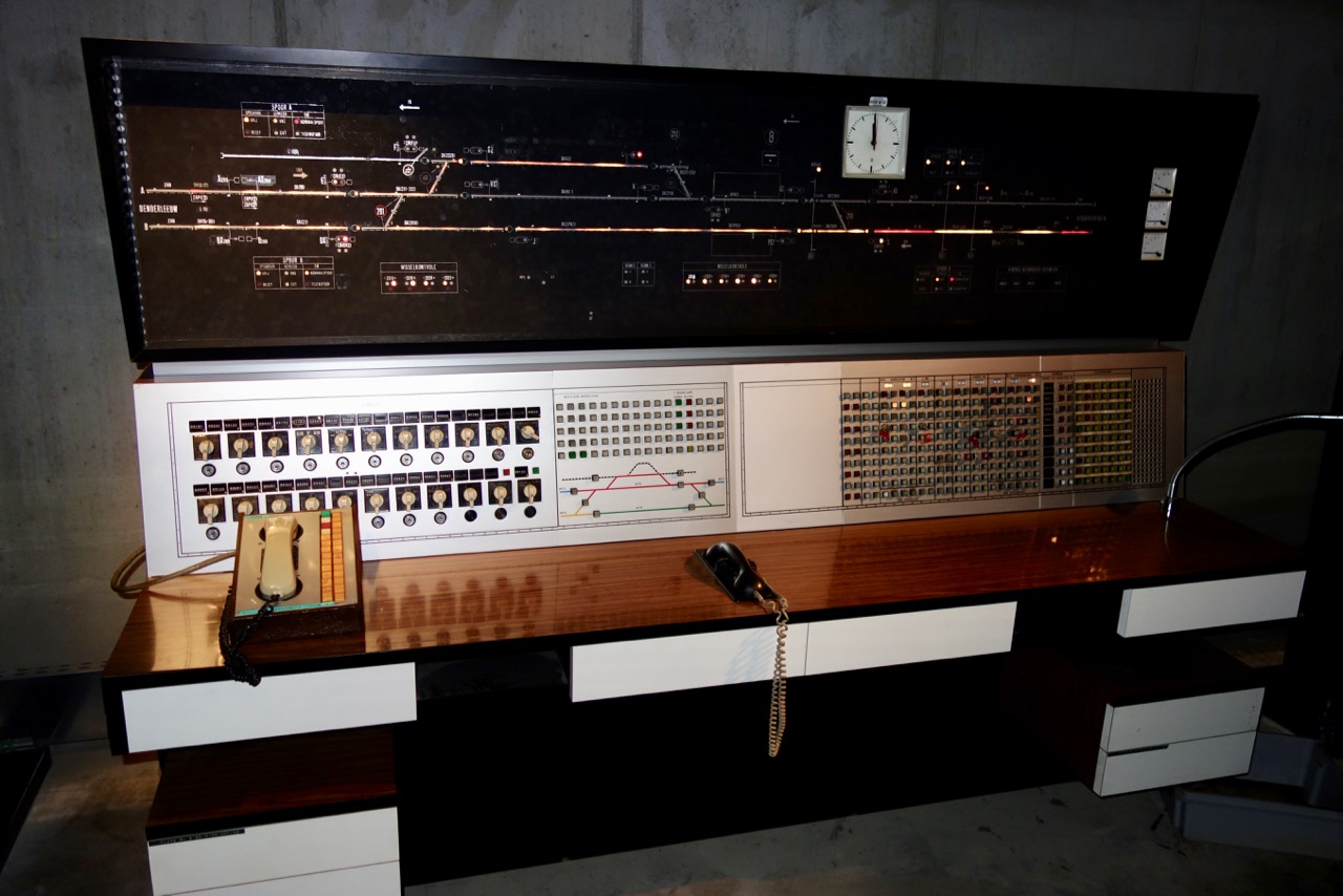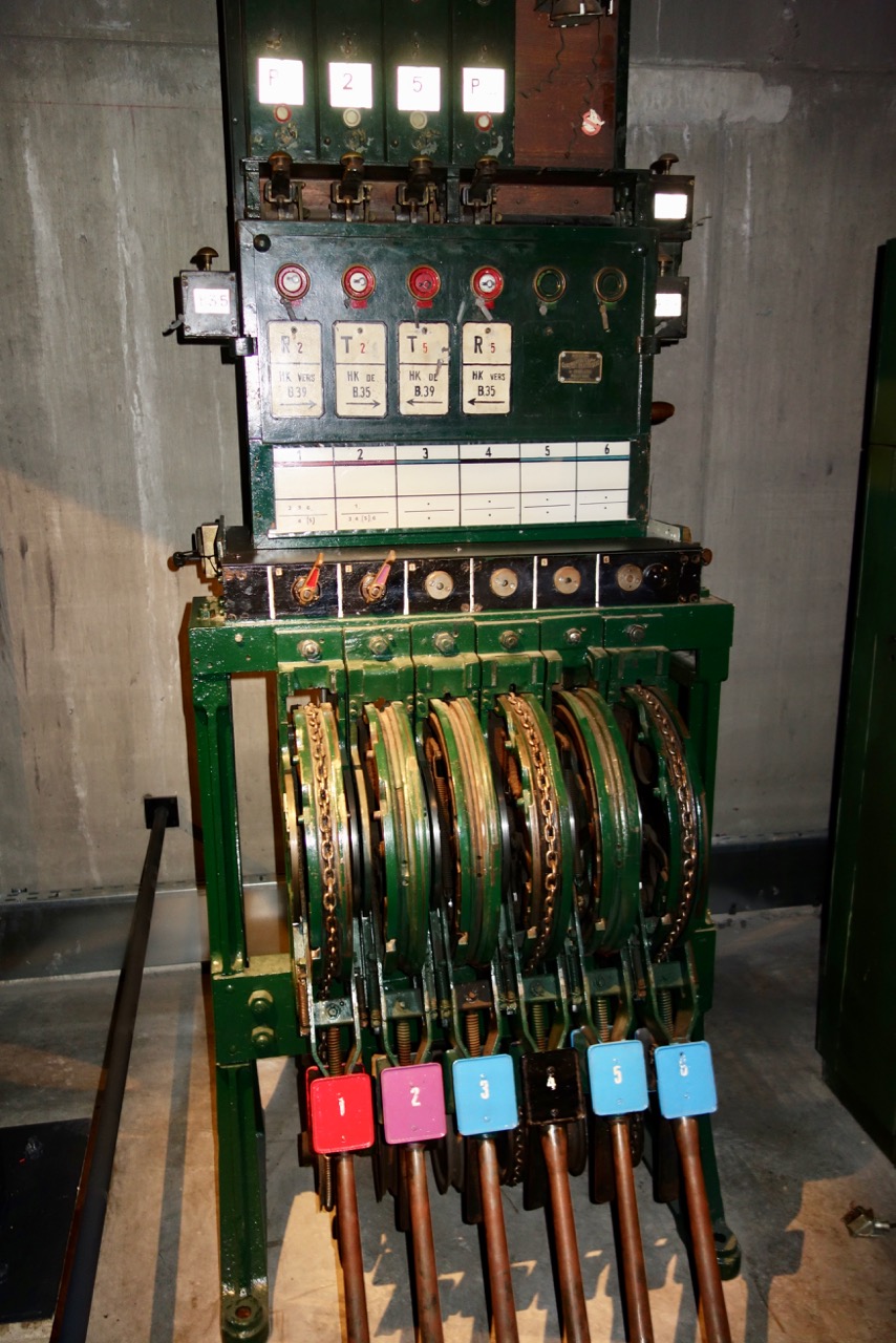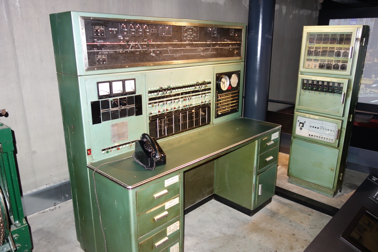 Кусочек экспозиции последнего зала посвящен инженерным сооружениям и управлению движением. В небольшом подвальчике (с намеком на то, что обычно они скрыты от глаз) размещены три пульта управления сигналами и стрелками: механический, сделанный Сименсом в межвоенный период релейный 50-х годов и релейный же 80-х Комментарии излишни.