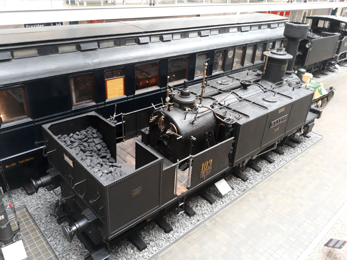 Как говорил уже, в Устецком крае есть еще музей в Хомутове, большое веерное депо, как в Лужне у Раковника. Лужна у Раковника относится к CD, Хомутов - к Национальному техническому музею (NTM). Этот музей имеет выставочные площади в Праге, где, в числе прочего, выставлены четыре паровоа (один промышленый, колеи 800 мм) и вагон-столовая из поезда Франца Иосифа (а потом и Эдуарда Бенеша, по традиции), построенный в 1891 г. там же, на Смиховском заводе - том самом, что строил трамваи.