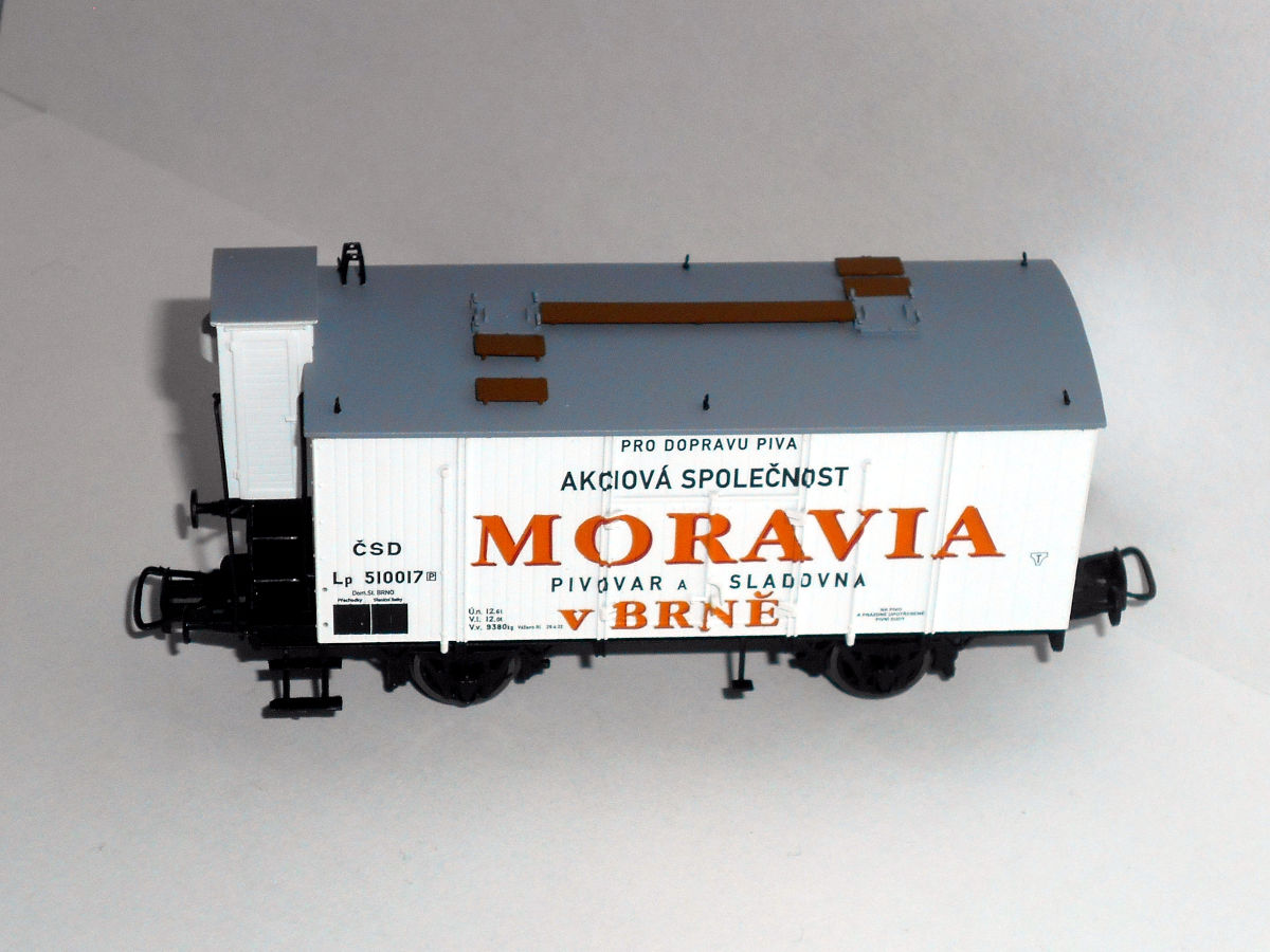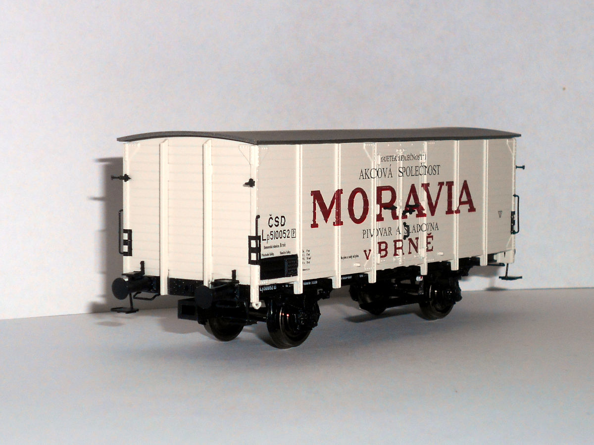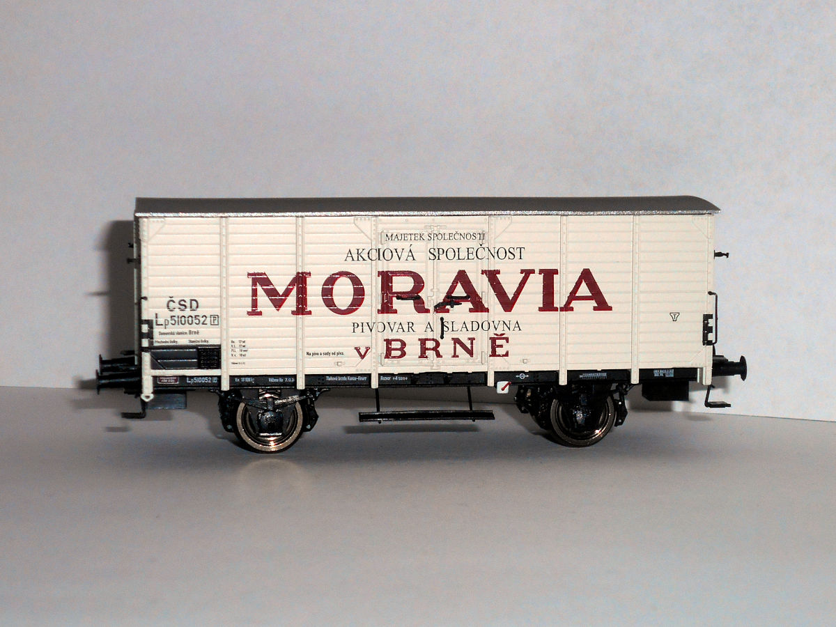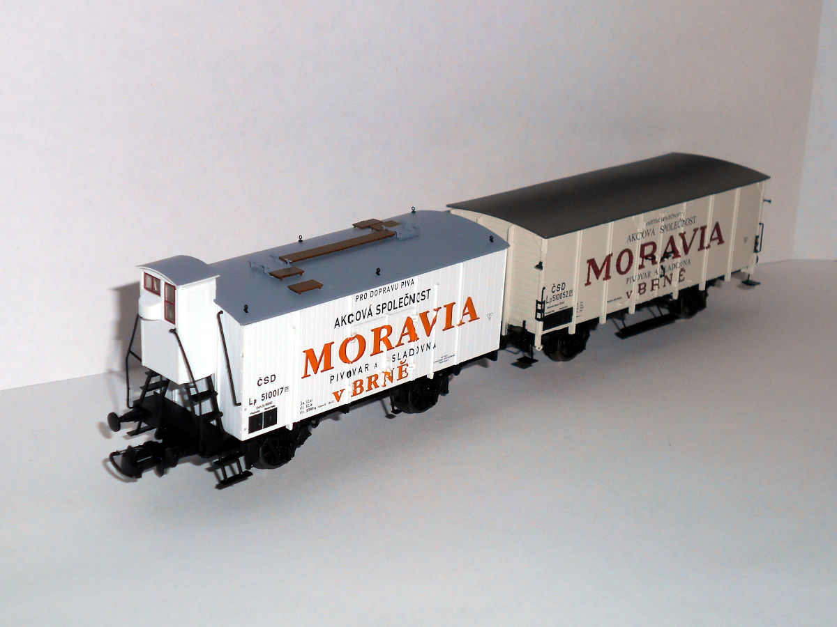 Кстати, о моравском пиве. Пивоварня, так и названная "Пивоварня Моравия в Брно", существует и работает по сей день. К сожалению, ни в одно из ее заведений не удалось попасть и оценить качество пива. Но удалось познакомиться с моделями ледников принадлежности этой фирмы. Выпускаются модели Heris (арт. 50032), соответствует прототипу II эпохи - но сам прототип находится на в Брно, а в Братиславе - вагон, в общем, знаком уже по Лужне у Раковника и Велке Бржезно, отличается только окраской, - и Brawa арт. 49777, на базе G10, III эпохи, со всеми ее атрибутами, но даты почему-то относятся к эпохе II.