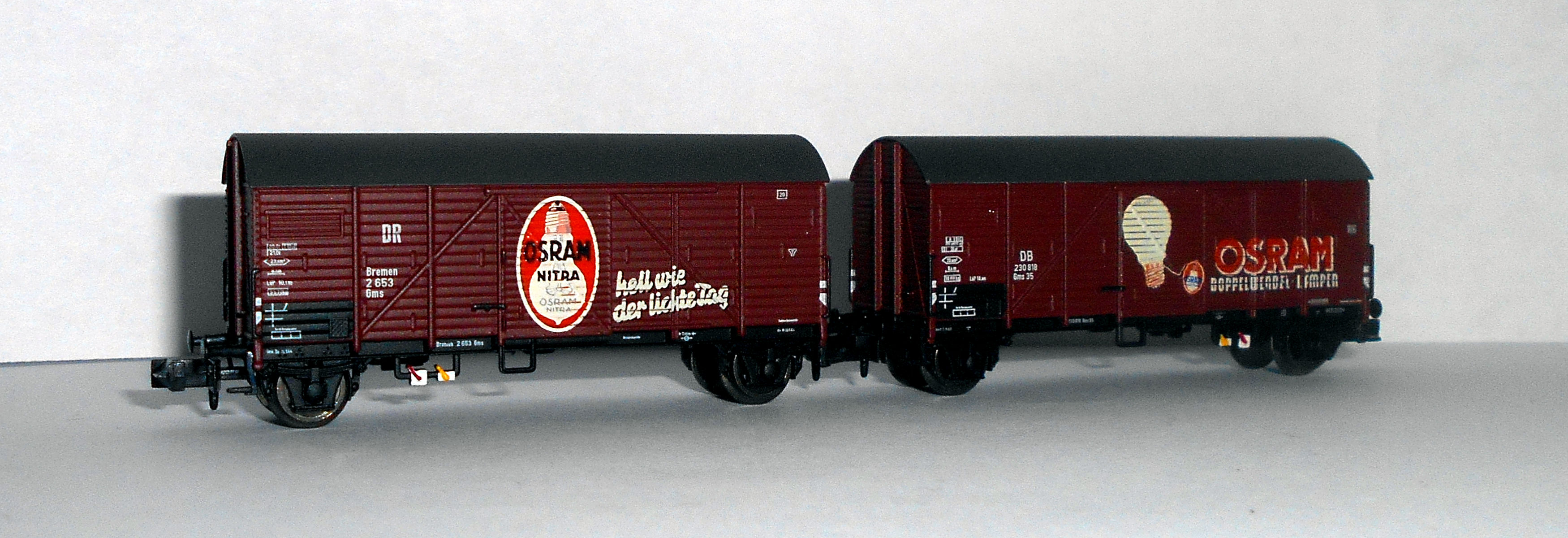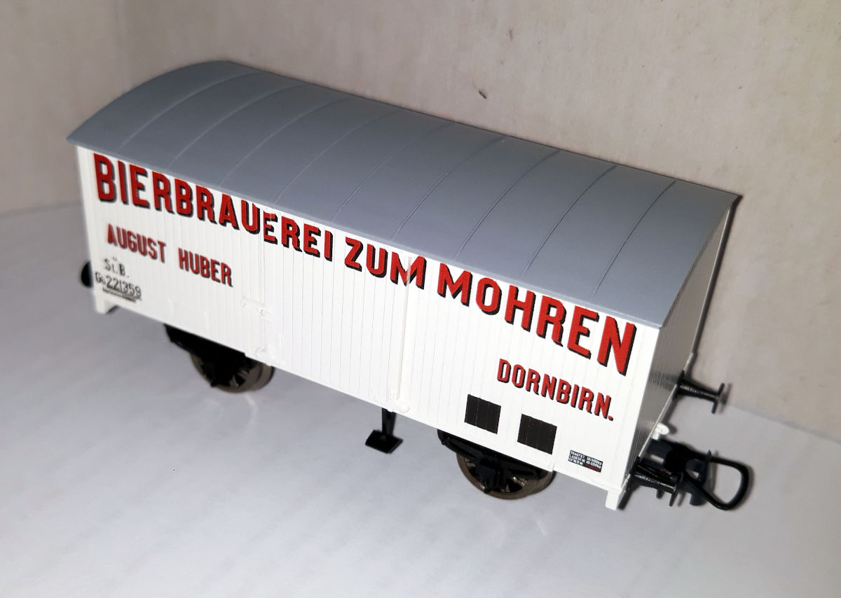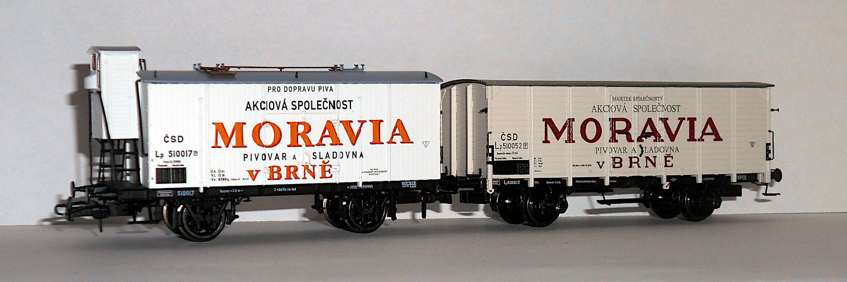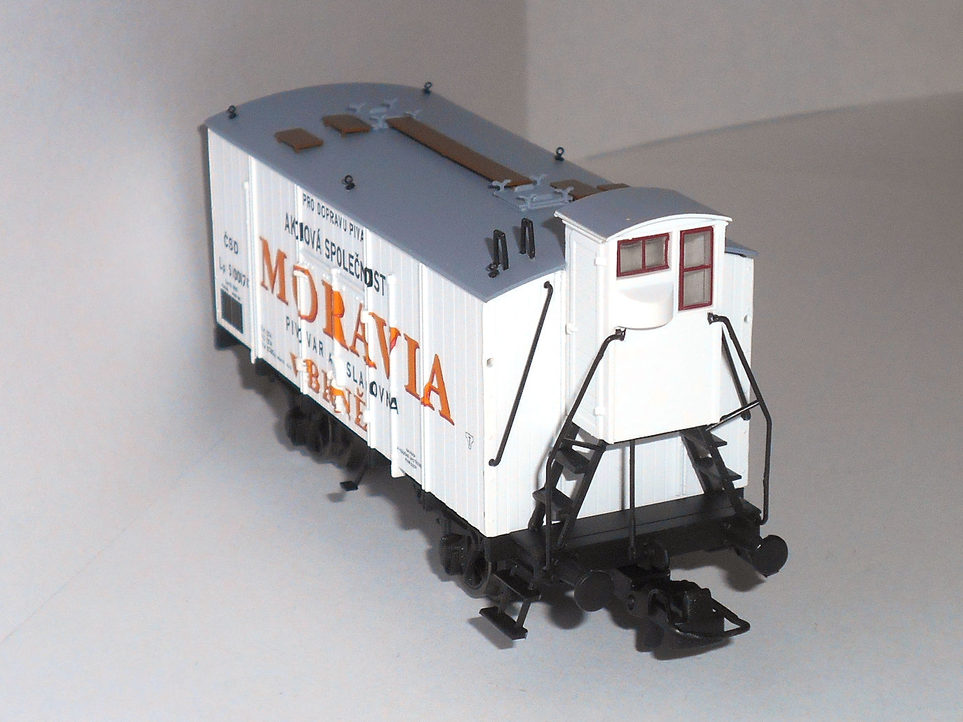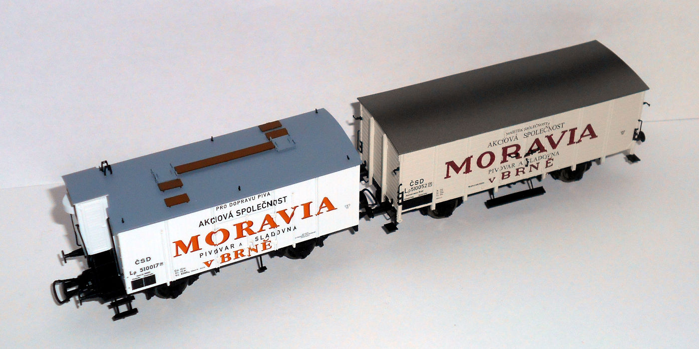 Кстати, о моравском пиве. Пивоварня, так и названная "Пивоварня Моравия в Брно", существует и работает по сей день. К сожалению, ни в одно из ее заведений не удалось попасть и оценить качество пива. Но удалось познакомиться с моделями ледников принадлежности этой фирмы. Выпускаются модели Heris (арт. 50032), соответствует прототипу II эпохи - но сам прототип находится на в Брно, а в Братиславе - вагон, в общем, знаком уже по Лужне у Раковника и Велке Бржезно, отличается только окраской, - и Brawa арт. 49777, на базе G10, III эпохи, со всеми ее атрибутами, но даты почему-то относятся к эпохе II.