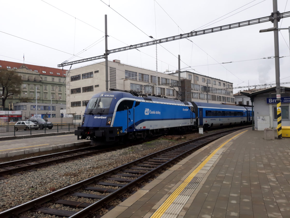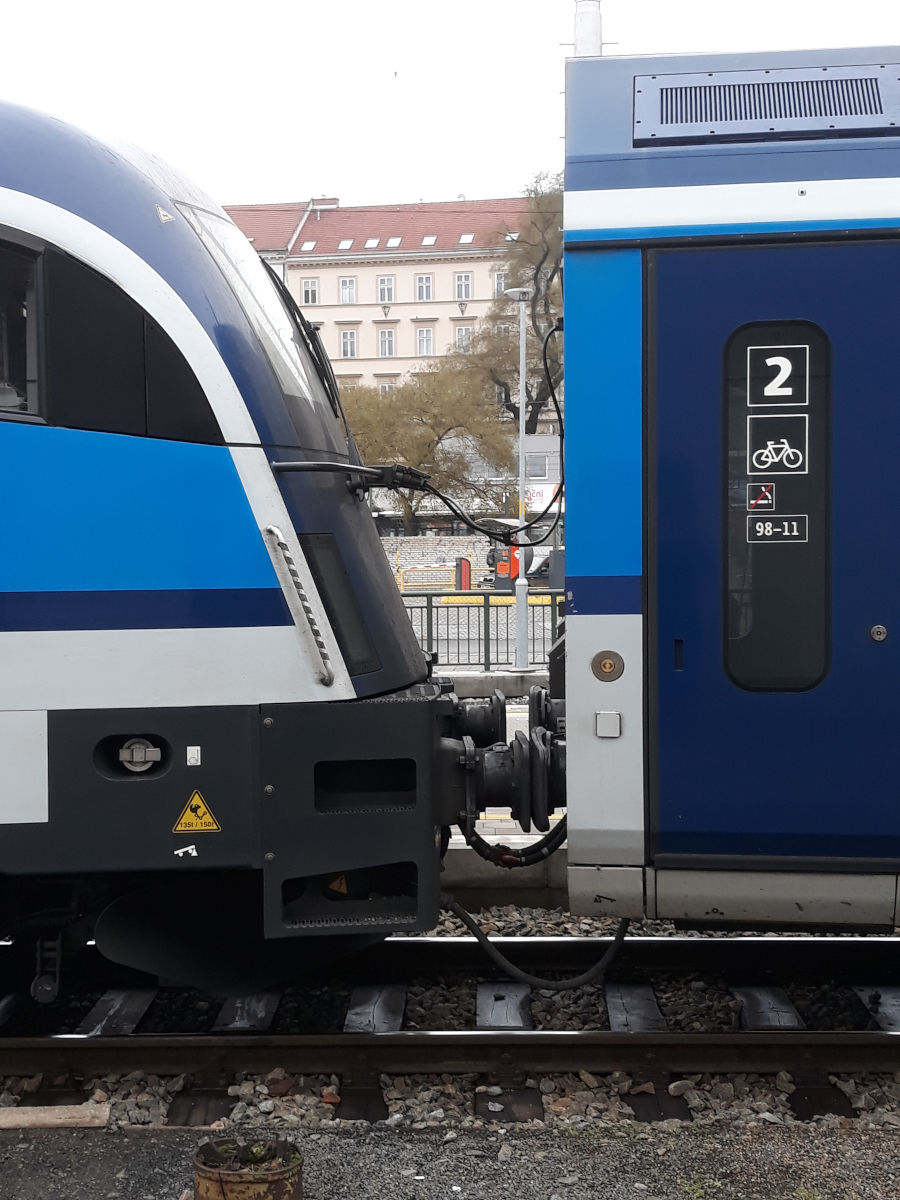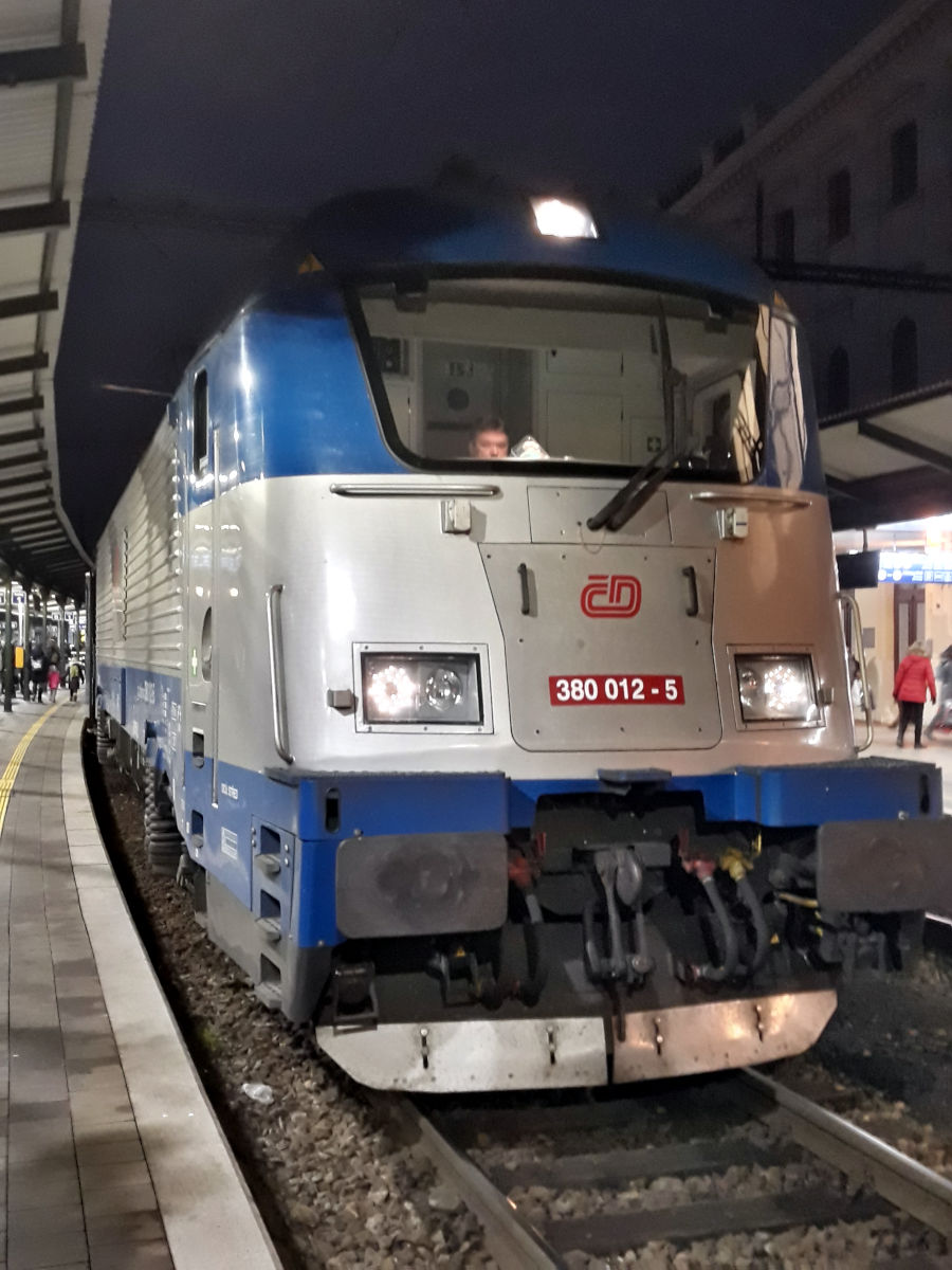 ...Вечером в воскресенье, даже при наличии карантинных ограничений, из Брно в Прагу поезда идут с интервалом 30 минут - Regiojet, Railjet и скорый, принадлежащий České dráhy, и билетов на них на все практически нет. Кстати, этот зоопарк поездов водит такой же зоопарк локомотивов: Regiojet под Traxx или Vectron, Railjet с Taurus 1216, скорый ČD - Škoda ČD380, она же 109 E1 по прозвищу "Ванна" (за внешность) или "Мессер" (за заводской тип 109Е).