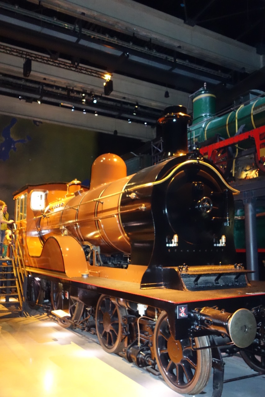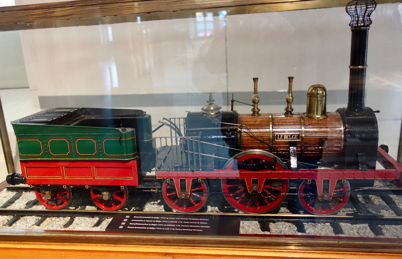 Впрочем, отказ от британской стратегии развития железнодорожной сети отнюдь не означал отказа от британских технологий. Три первых локомотива (La Flèche - стрела, L'Eléphant и Stephenson), были куплены у Стефенсона, а сам он инкогнито прокатился на первом поезде. Даже первый локомотив бельгийской постройки - La Belge, 1835 год - был лицензионной копией Patentee. Вот его модель Принято считать, что это первый локомотив, построенный в континентальной Европе. С этого момента локомотивы в Бельгии строились массово, хватало и на собственные нужды, и на экспорт. Что отнюдь не удивительно, Бельгия была на тот момент одной из самых промышленно развитых стран. Поэтому моделей местных паровозов в первом зале немало. Что интересно, присутствуют также модели вагонов: багажных, пассажирских, товарных. Вот, например, Кстати, модели изготовлены учениками железнодорожных специальностей как часть их ученичества.