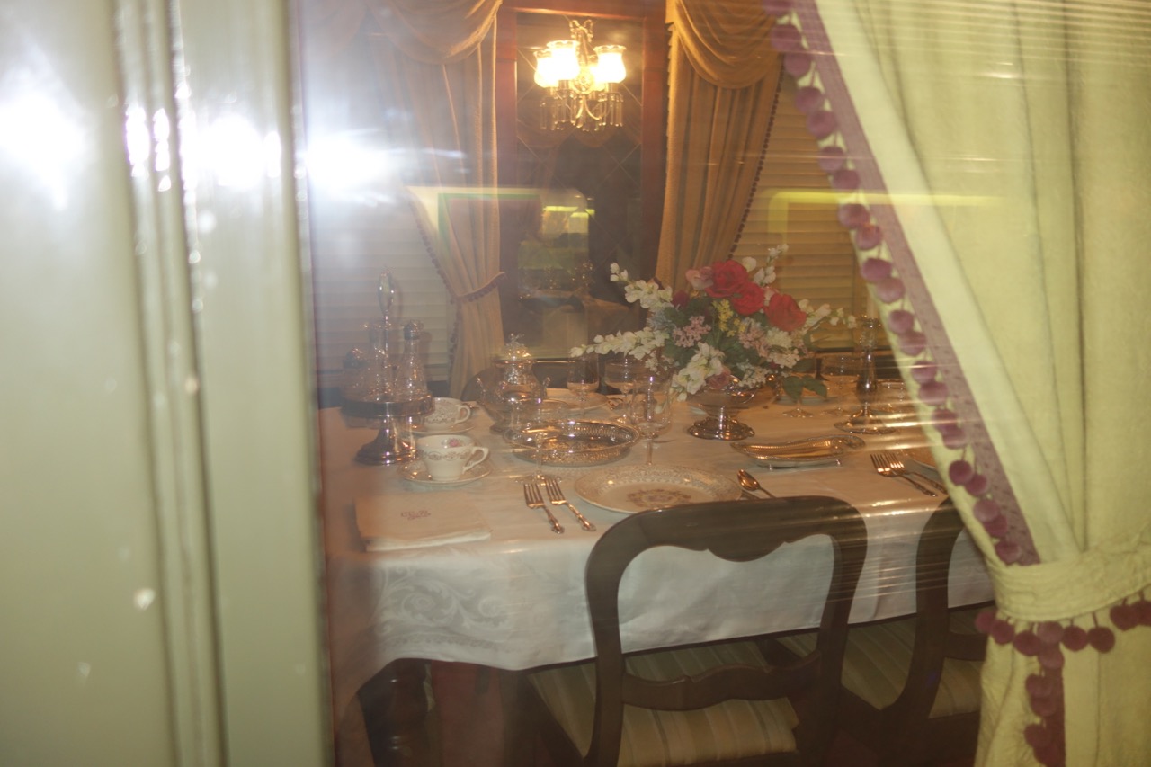 Один из таких вагонов представлен в экспозиции. Построили его в начале XX века и за свою долгую жизнь он многократно менял хозяев. В 1948 году его приобрели писатели Луций Биб и Чарльз Клегг и оформили под свои вкусы. Внутрь, увы, не пускают, так что пришлось фотографировать через окна. Так выглядела столовая