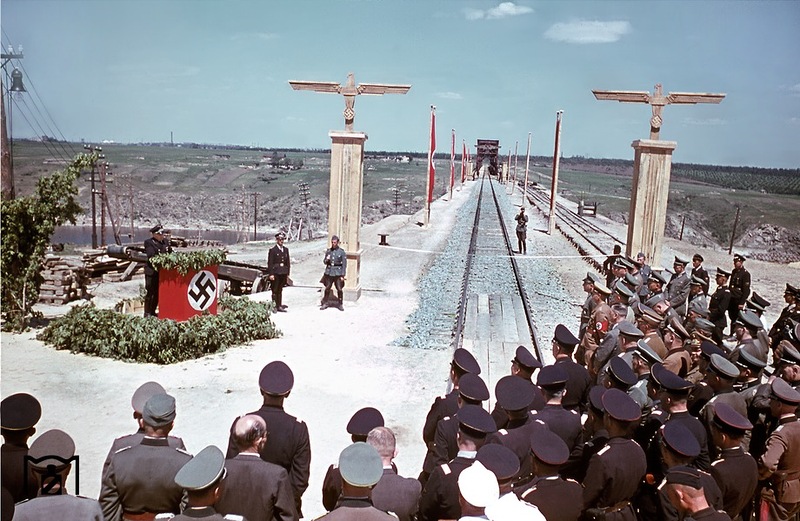 1.Июль 1943 г., немцы открывают железнодорожный мост через Днепр у Запорожья: Открытие моста через Днепр в Запорожье в присутствии множества видных нацистских деятелей. Радоваться новому мосту оставалось лишь несколько месяцев, т.к. уже осенью 43-го перед надвигающимся русским фронтом мост был вновь взорван немцами. (07.1943)