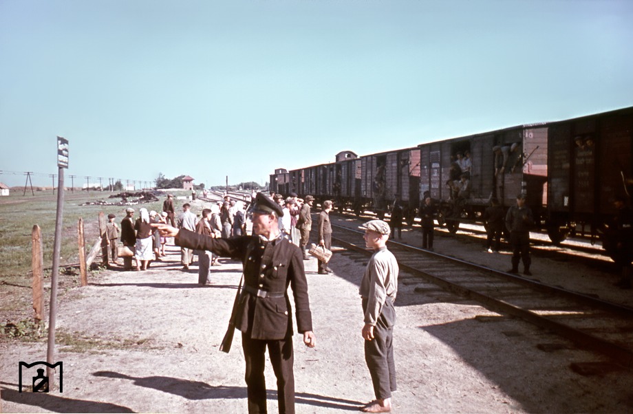 Люди слишком спокойно залазят в вагоны. Внутри наблюдается корзина для продовольствия. На заднем плане "несчастные депортируемые" расслабленно и непринужденно разговаривают с "полицаями", покуривая при этом. Остальной народ вполне спокойно сидит в вагонах свесив ноги - ну вообще не похоже на депортацию.